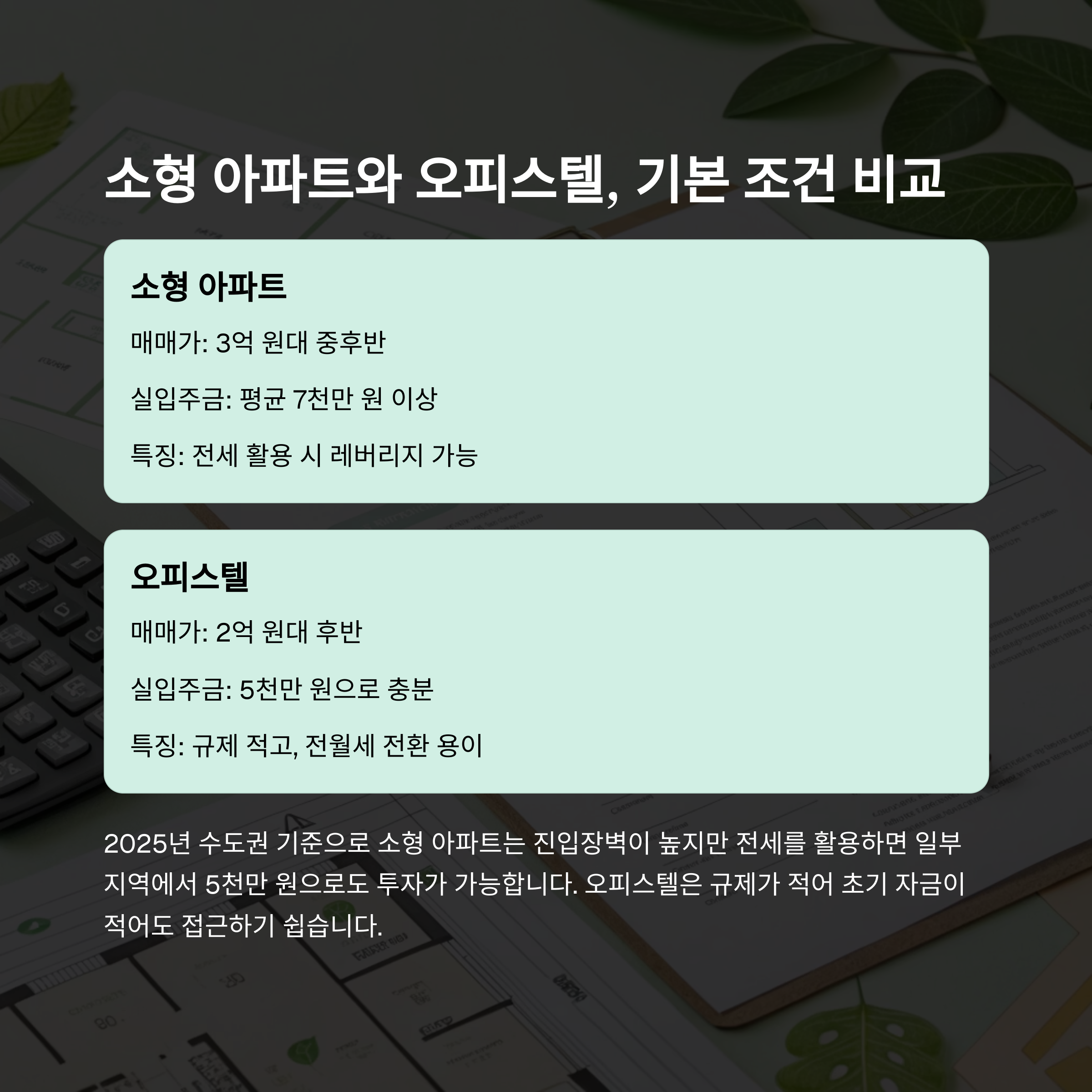 2025년 수도권 기준으로 소형 아파트는 3억 원대 중후반, 오피스텔은 2억 원대 후반의 매매가를 보이고 있습니다.
