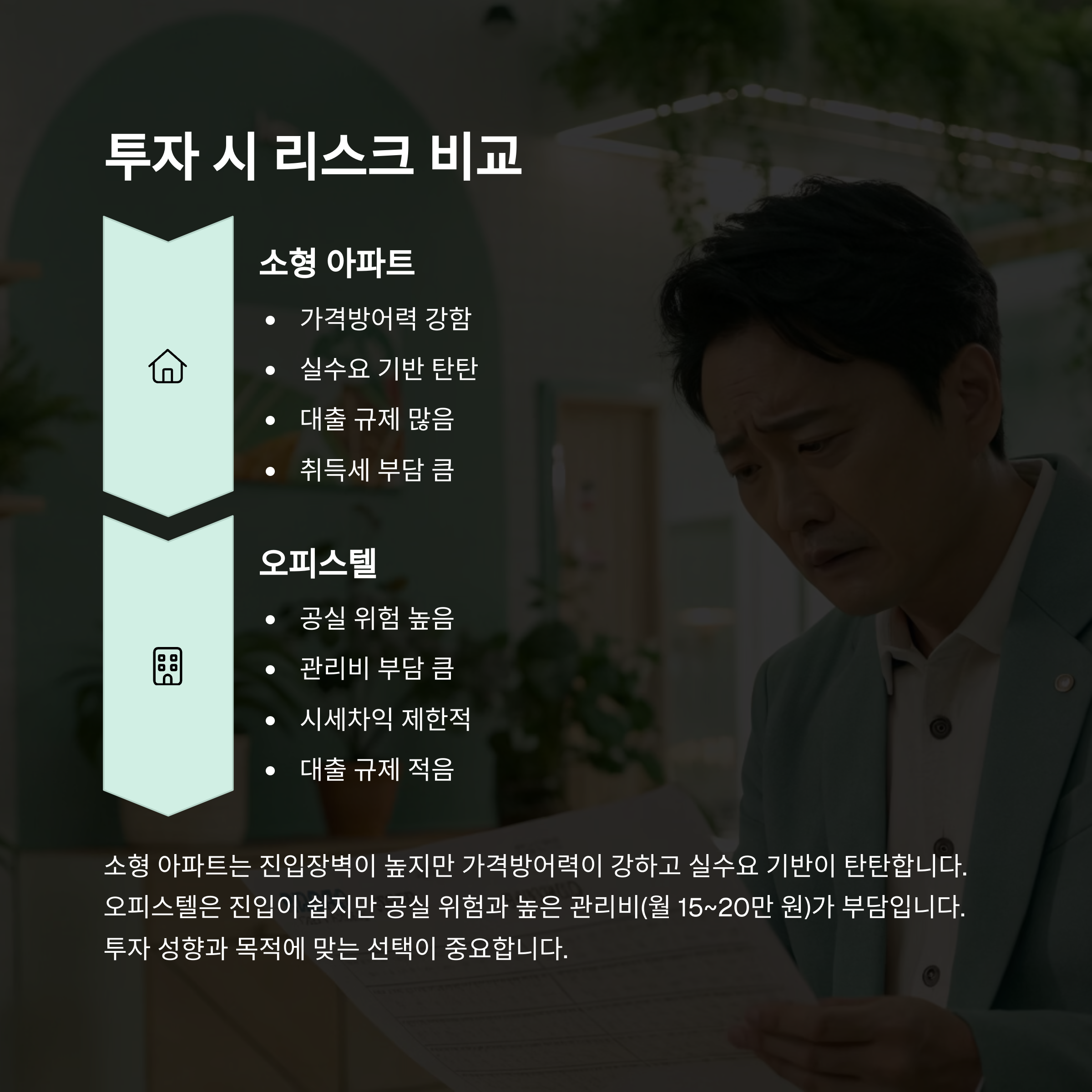 소형 아파트는 가격방어력이 강하고 실수요 기반이 탄탄하지만, 대출 규제와 취득세 부담 등 진입장벽이 상대적으로 높습니다.
