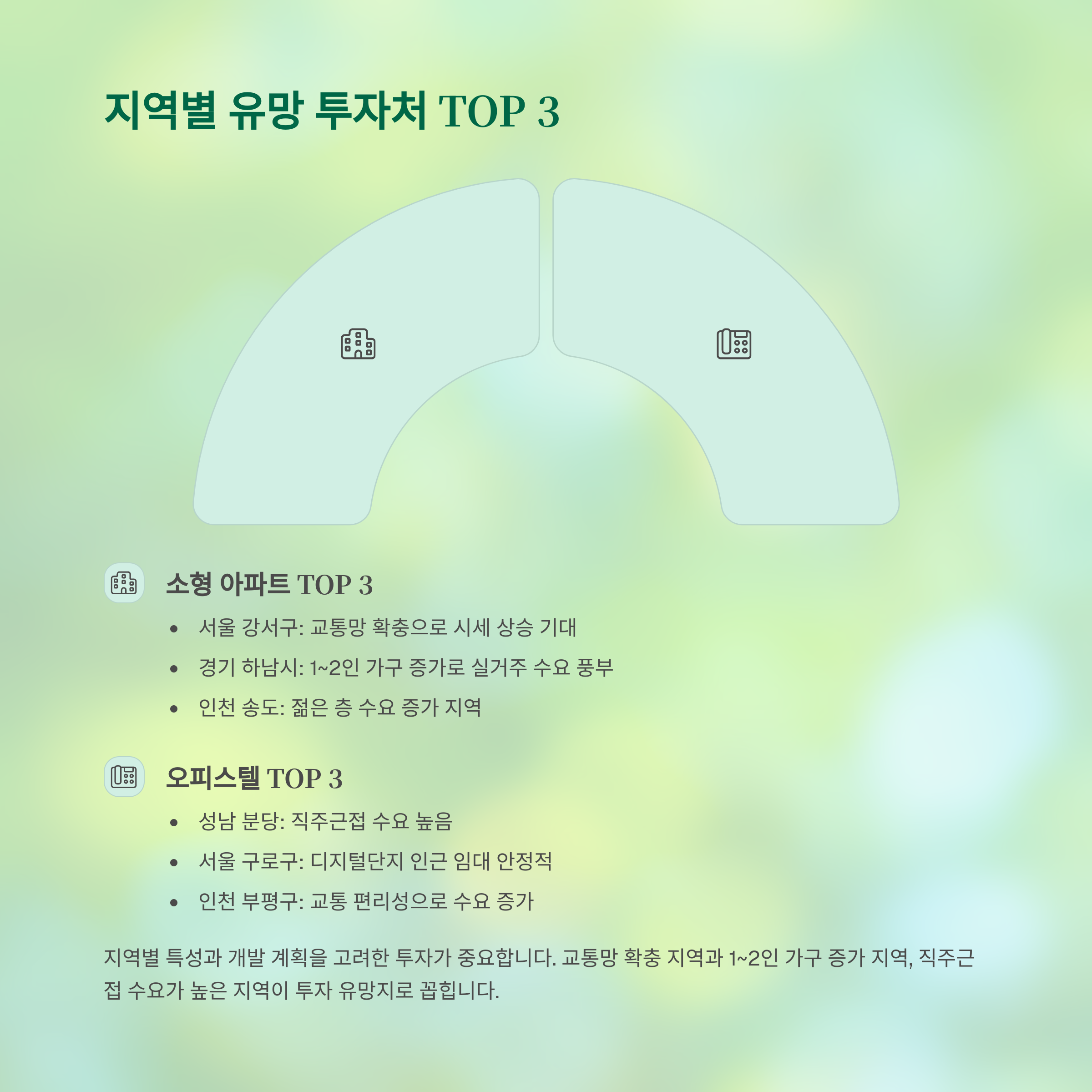 서울 강서구는 교통망 확충으로 인한 시세 상승 기대가 크고, 하남시와 송도는 1~2인 가구 증가로 실거주 수요가 풍부합니다.