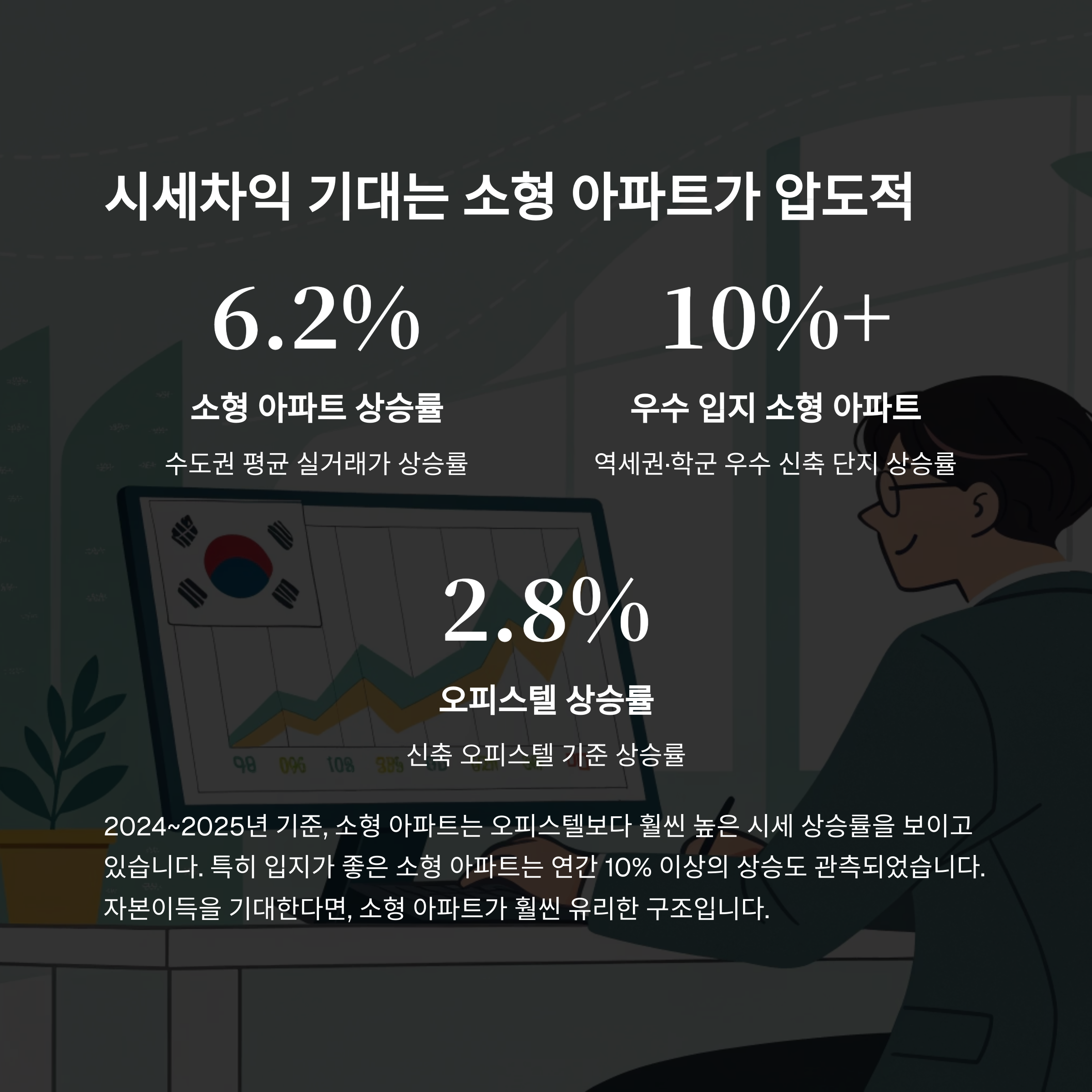 결론적으로 자본이득을 기대한다면, 소형 아파트가 훨씬 유리한 구조입니다.