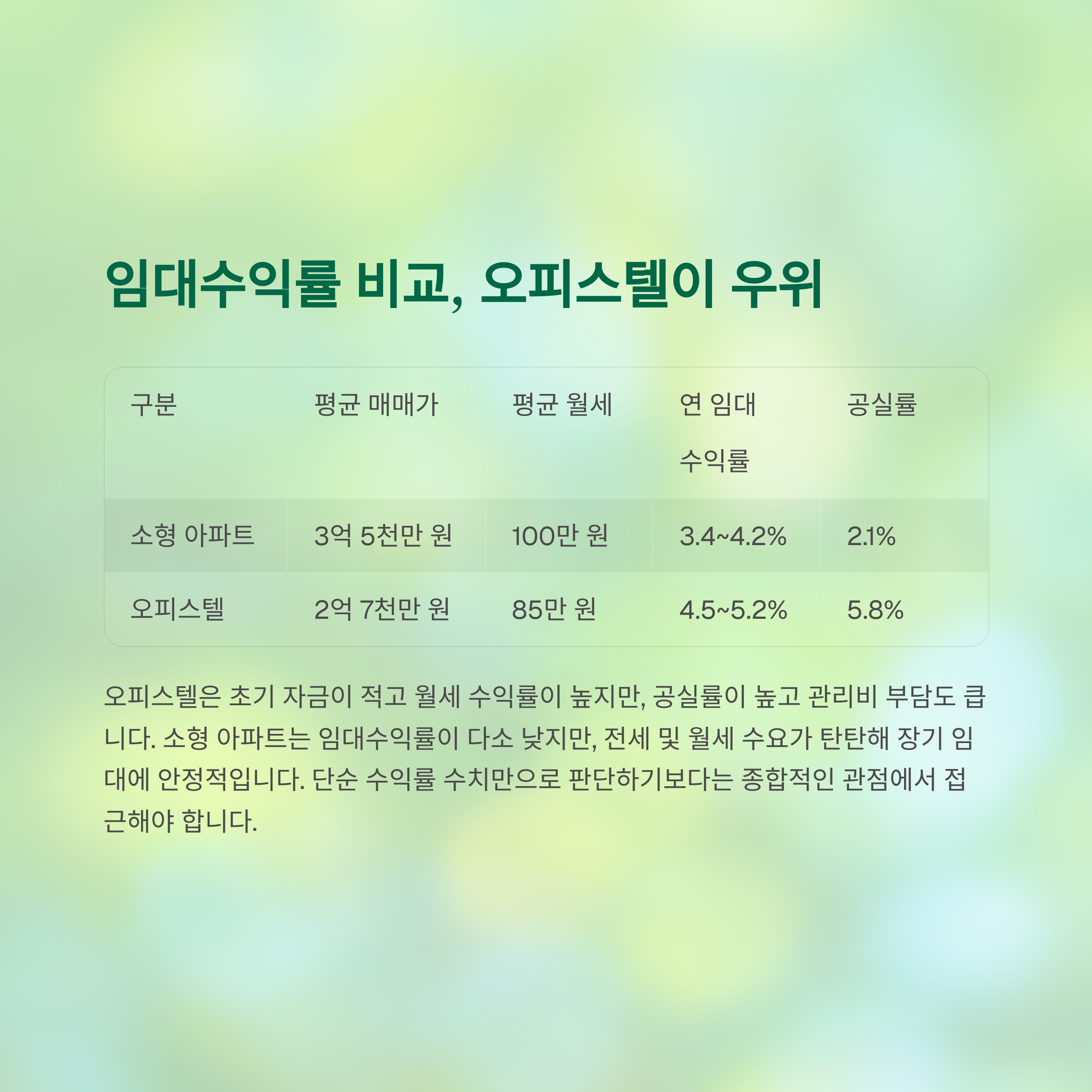 오피스텔은 초기 자금이 적고 월세 수익률이 높은 편입니다.