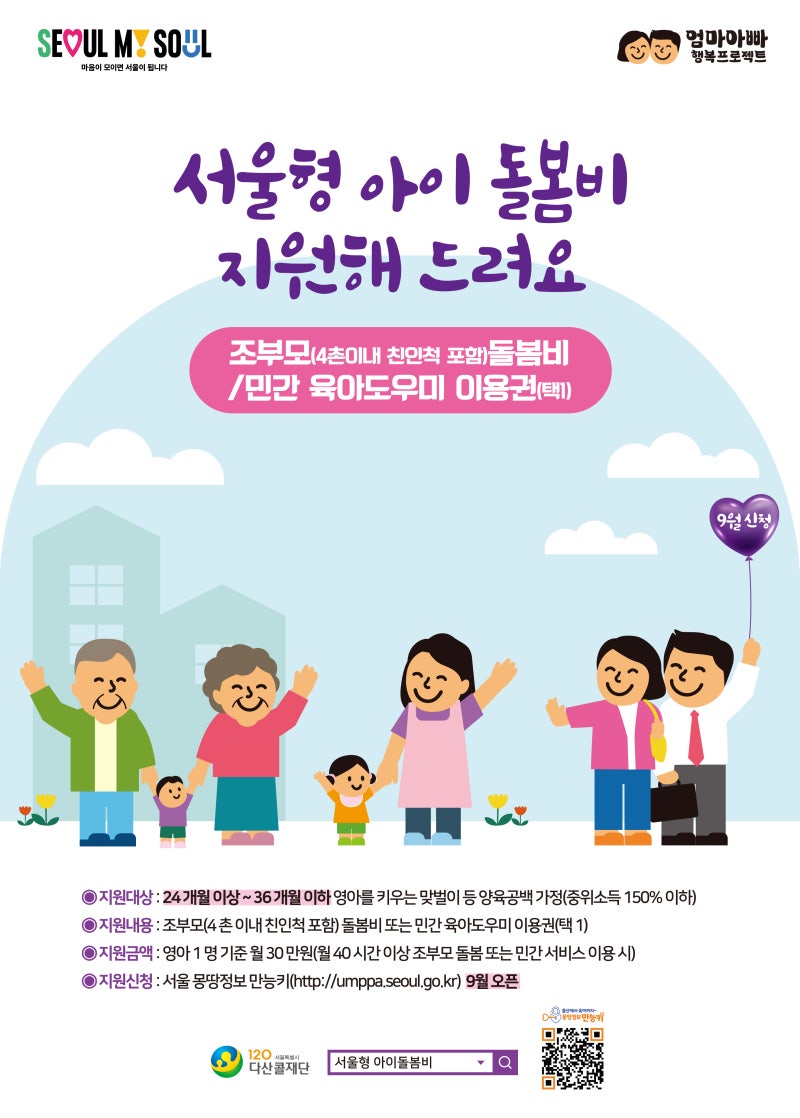 | 서울형 아이돌봄비 | 서울 거주 가정 | 월 30만 원 | 소득 150% 이하 |
