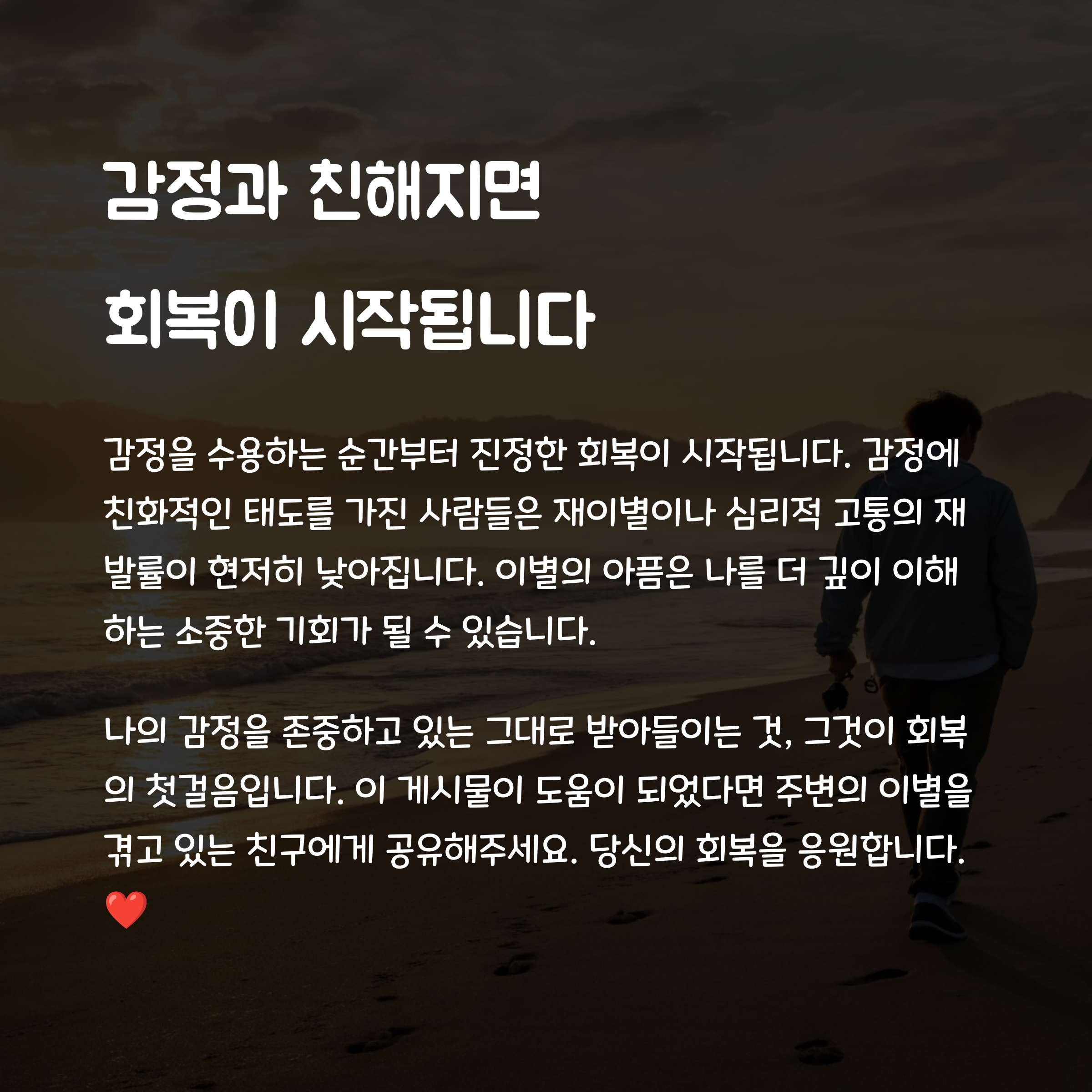 이별은 누구에게나 찾아올 수 있는 통과 의례입니다. 하지만 그 속에서 나의 감정을 외면한다면, 진짜 회복은 어렵습니다. 감정 정리는 잊기 위한 수단이 아니라 나를 이해하고 돌보기 위한 첫걸음입니다. 오늘도 당신의 감정은 소중합니다. 어떤 감정이든, 그것이 ‘당신’입니다. 이 글을 통해 조금이나마 마음의 무게를 덜어내셨기를 바랍니다.