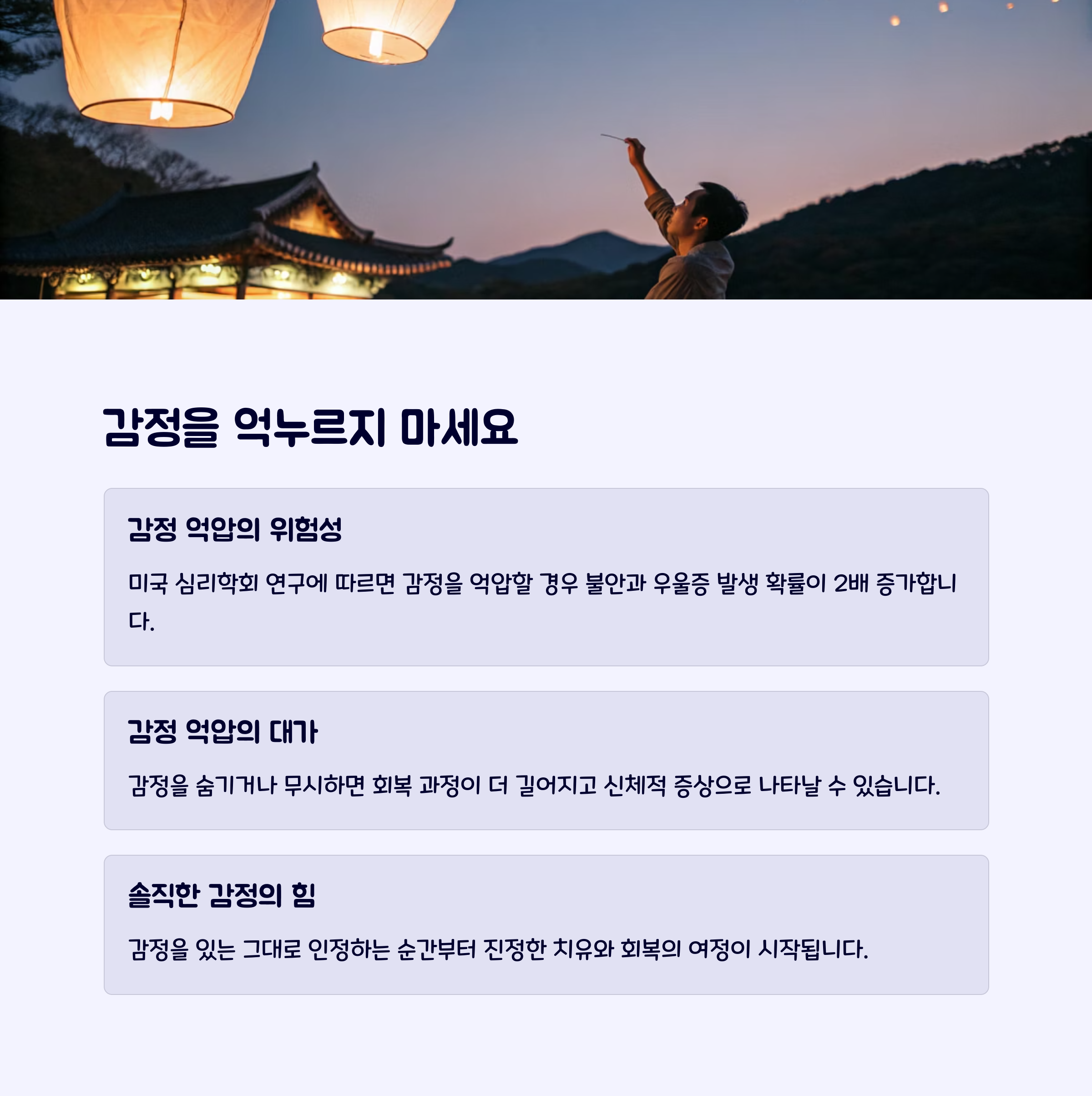 | 왜 중요한가요? | 회복보다 먼저 감정을 정리해야 치유가 시작됩니다 |
