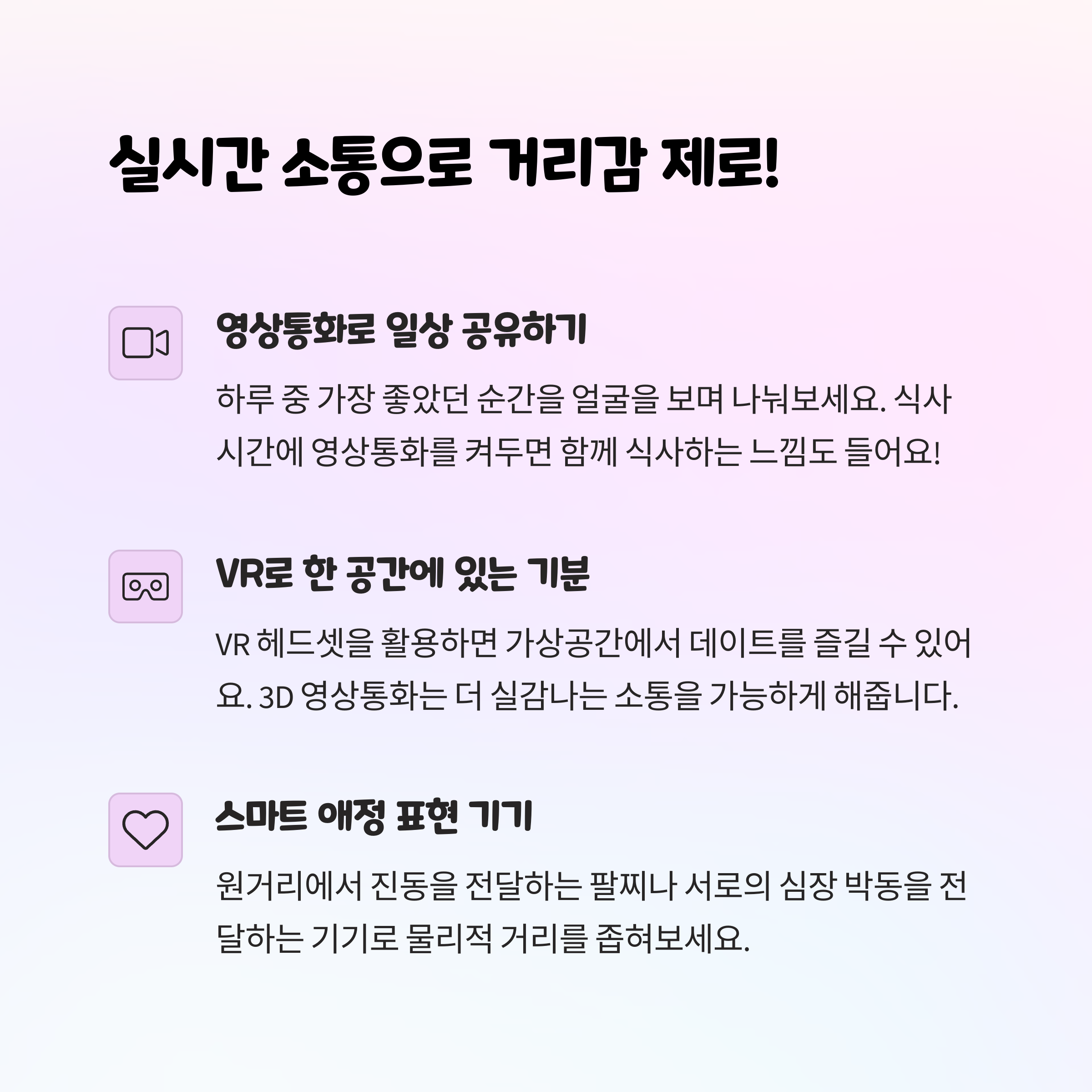 | 누구에게 필요할까? | 장거리 연애 중이거나 일상적으로 떨어져 있는 커플에게 유용해요. |
