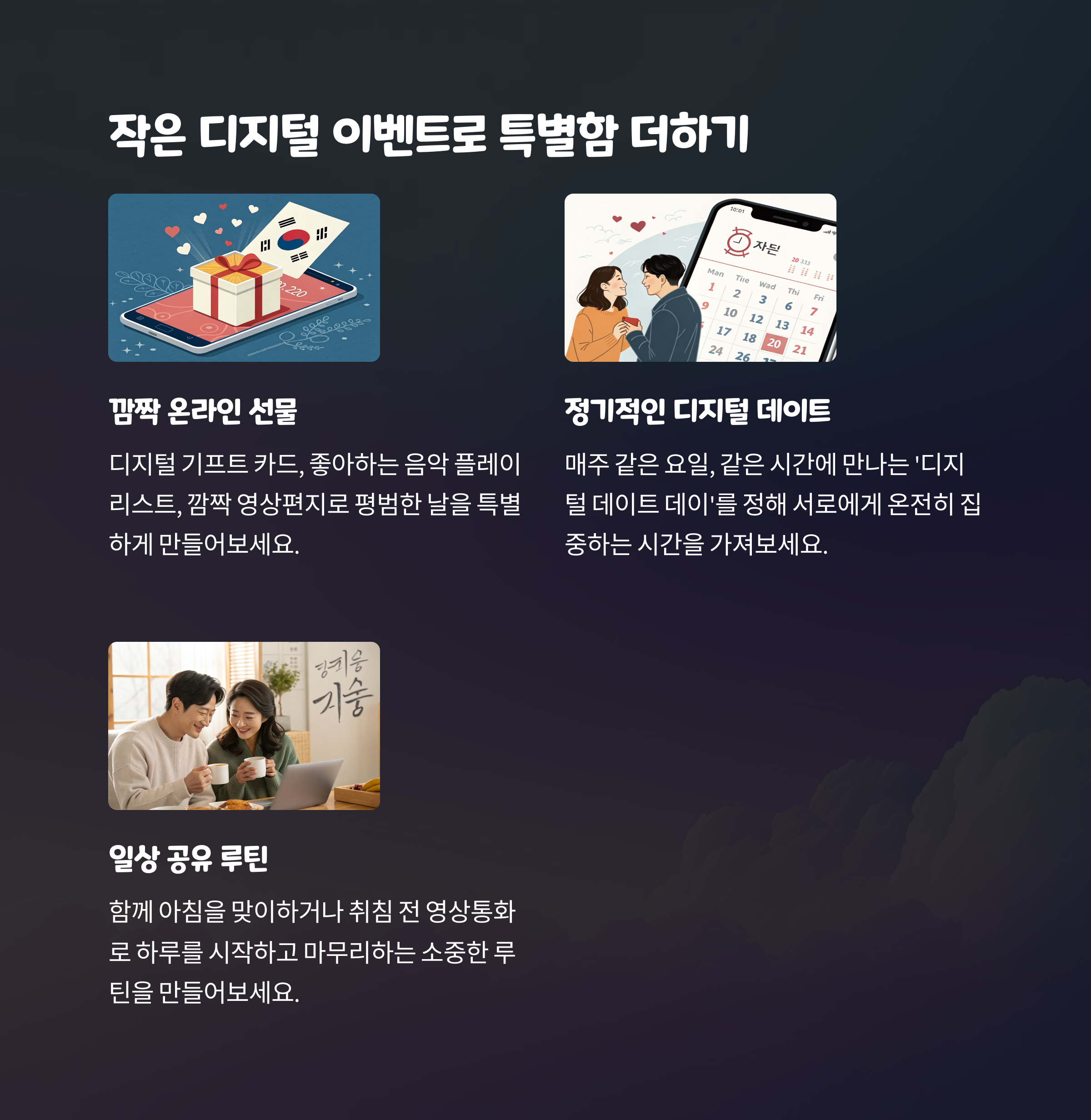 장거리 연애를 하고 있는 커플이라면 한 번쯤은 서로 다른 도시에 있다는 이유만으로 생기는 외로움과 불안을 겪어보셨을 거예요. 물리적인 거리만큼 마음의 거리도 멀어질까 걱정되는 순간들, 참 많죠. 하지만 요즘은 디지털 기술의 발달로 그 거리를 충분히 좁힐 수 있게 되었답니다. 단순히 전화 통화만 하던 시절을 지나, 이제는 실시간 영상 통화부터 온라인 게임, 공동작업 도구까지 다양한 방법으로 데이트의 형태도 진화했어요. 장거리 연애는 단지 '참는 사랑'이 아니라, 새로운 방식의 깊은 관계를 만들어가는 특별한 연애 방식입니다. 오늘은 그런 커플들을 위해 실제로 많은 장거리 커플들이 실천하고 있는 디지털 데이트 아이디어를 소개해보려 합니다. 단지 대화만 나누는 것을 넘어서, 함께 추억을 만들고 감정을 나누는 디지털 시대의 스마트한 연애법이 당신의 사랑에도 따뜻한 활력을 불어넣어줄 거예요. 이 글을 통해 소중한 그 사람과 더 가깝게 느껴질 수 있기를 바랍니다.