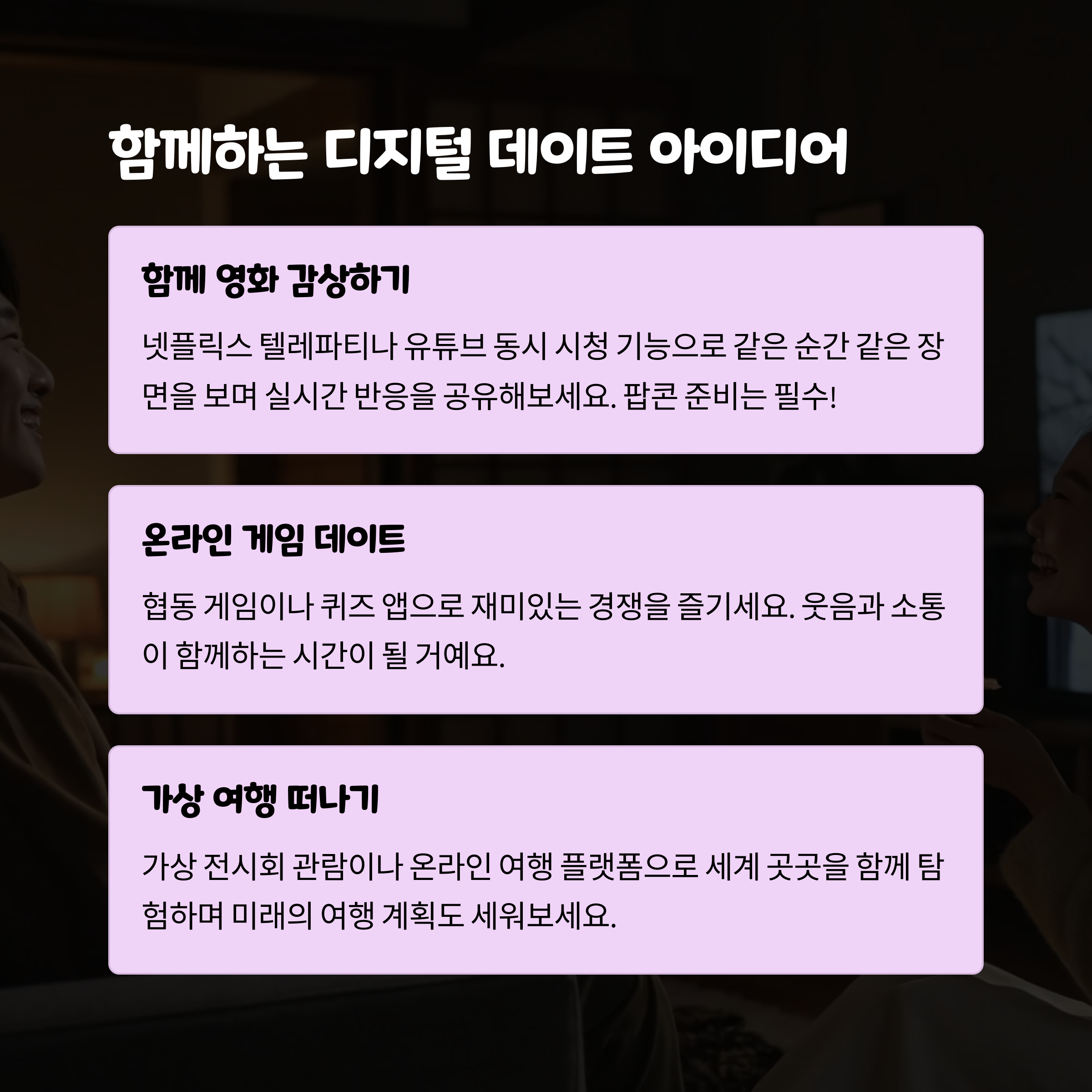 | 실시간 요리 대결, 저녁 식사 데이트 | 버킷리스트 작성, 공동 캘린더 운영 | 넷플릭스 같이 보기, 게임 플레이 |