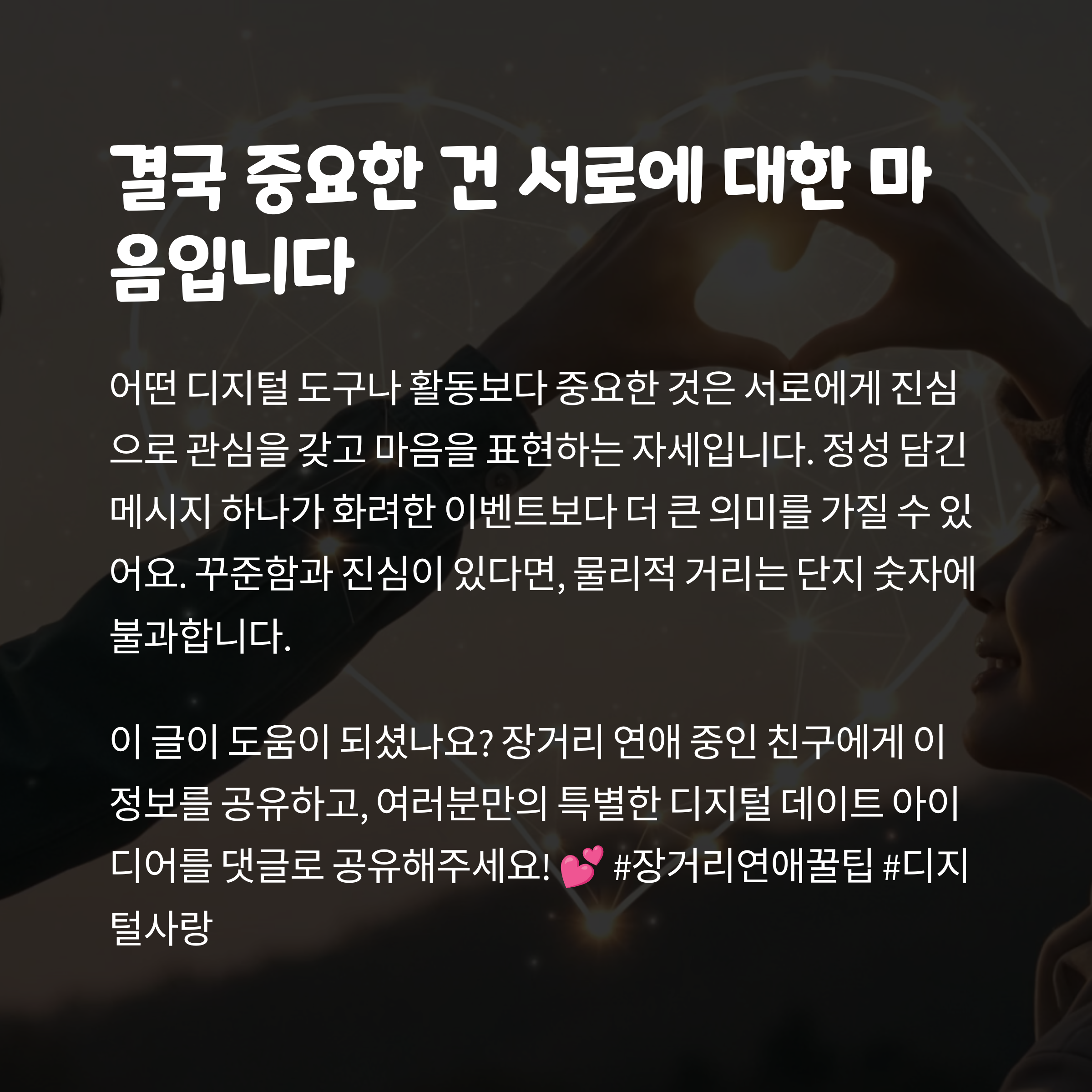 장거리 연애는 많은 인내와 배려가 필요한 관계입니다. 하지만 디지털 시대의 우리는 다양한 기술을 활용해 그 거리를 마음으로는 좁힐 수 있어요. 단지 보고 싶다는 말보다, 함께 활동하고 추억을 만들 수 있는 노력들. 그것이야말로 장거리 연애를 특별하게 만들어 주는 가장 강력한 사랑의 표현일 것입니다.