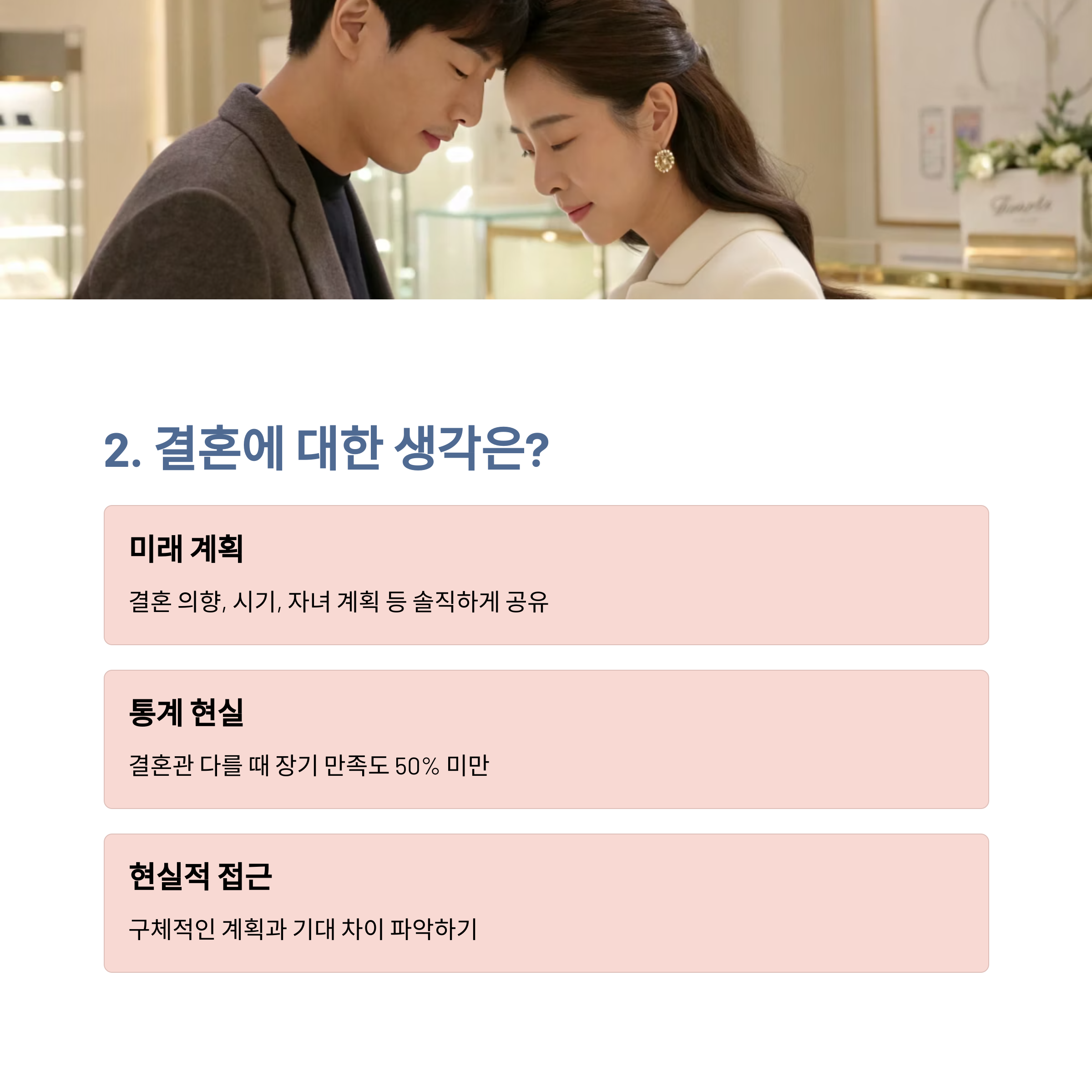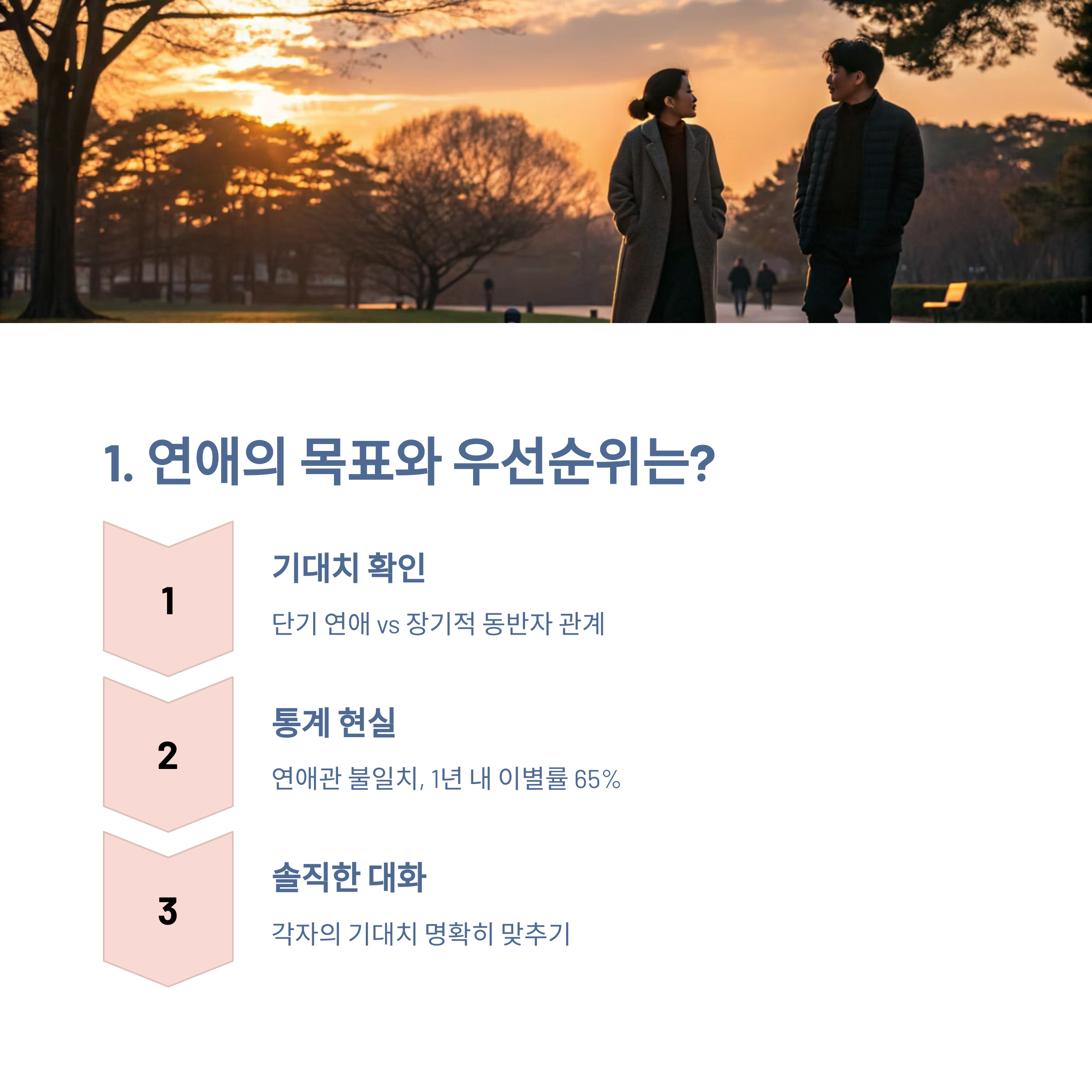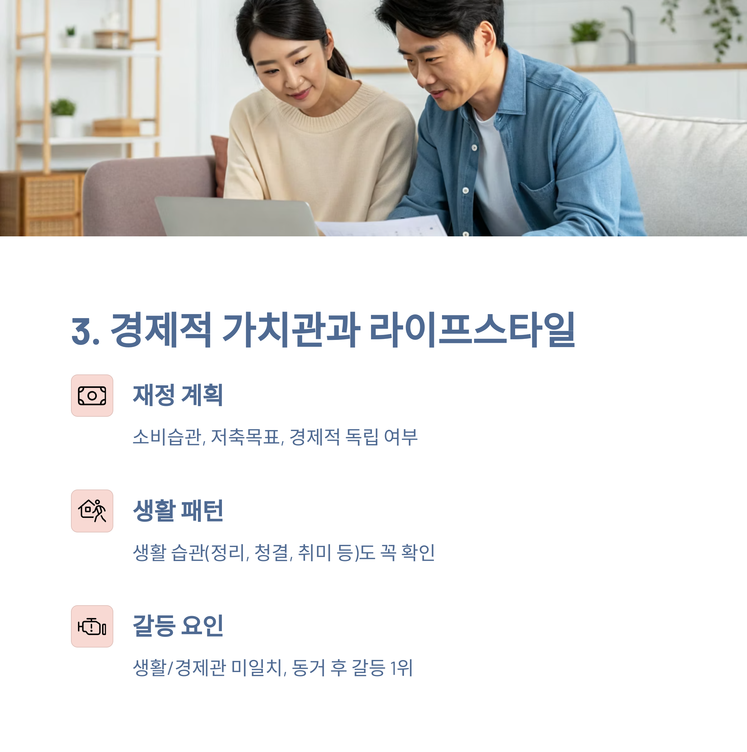| 장기적인 관계를 원하는지 확인 필요 | 소비 성향과 저축 습관도 중요 | 일상 리듬과 생활 방식 공유 |