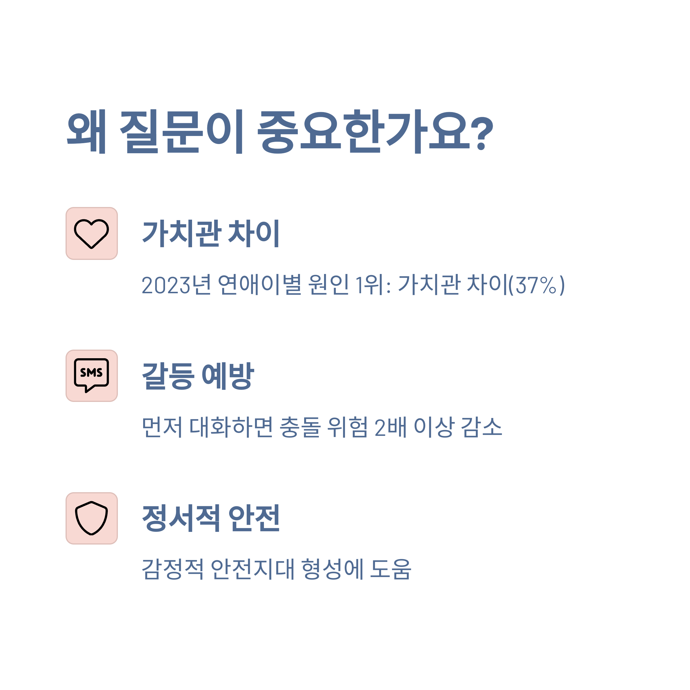 연애는 감정에서 시작되지만, 그 관계를 이어가는 데에는 감정보다 더 많은 것이 필요합니다. 특히, 서로 다른 환경에서 자라온 두 사람이 만나 관계를 맺는다면, 자연스럽게 가치관과 생활 습관의 차이가 드러납니다. 이런 차이를 이해하고 조율하는 과정은 쉽지 않지만, 연애 초기에 중요한 질문을 주고받는 노력은 그만큼 중요합니다. 사랑하는 감정이 깊어지기 전에 서로의 연애 목적, 결혼에 대한 생각, 경제관념 등 핵심적인 부분을 확인해야 감정적 소모를 줄이고 건강한 연애로 이어질 수 있습니다.