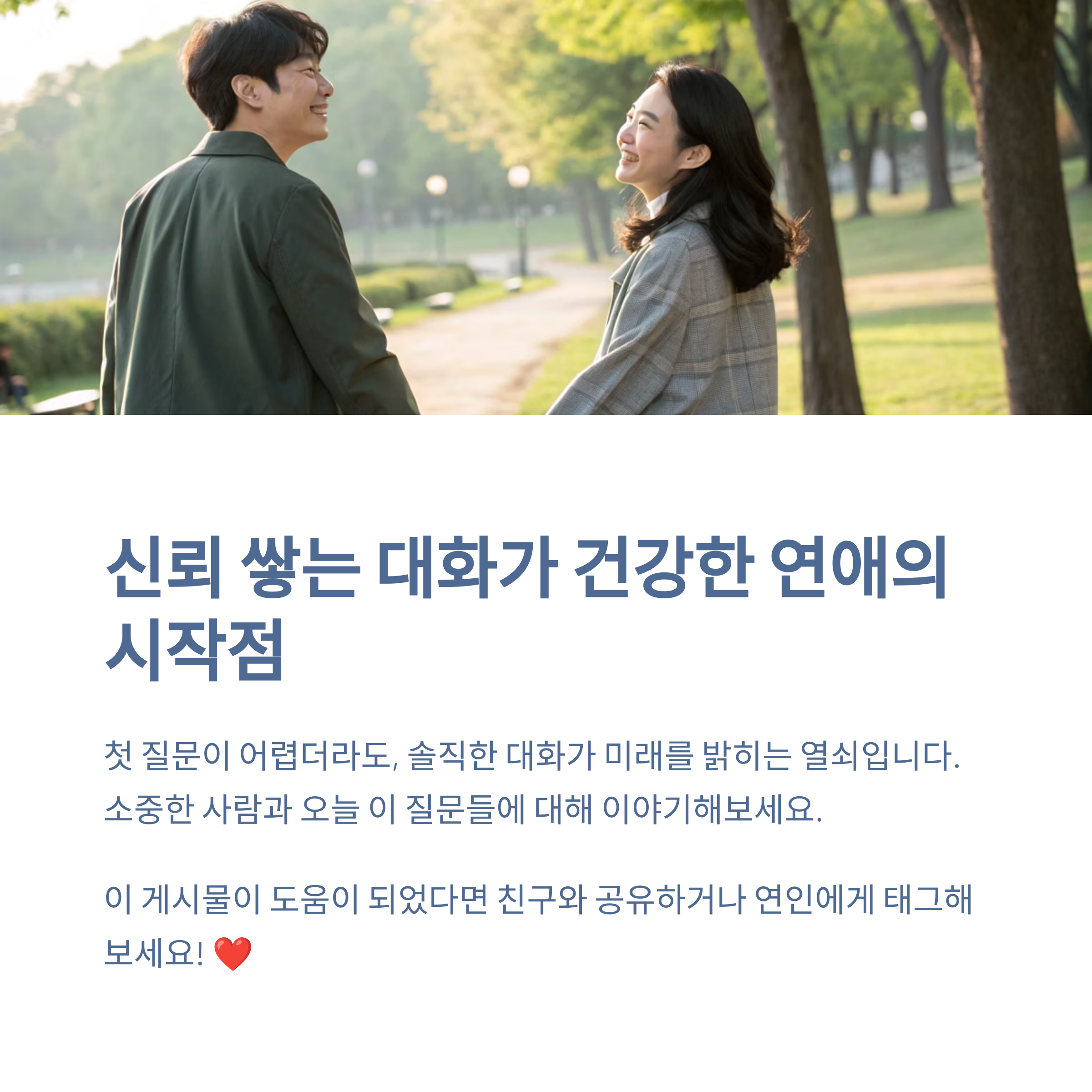 여러분은 연애를 시작하기 전에 어떤 질문을 꼭 던지시나요? 댓글을 통해 다양한 의견을 나눠주세요. 서로의 경험이 또 다른 누군가에게 큰 도움이 될 수 있습니다.