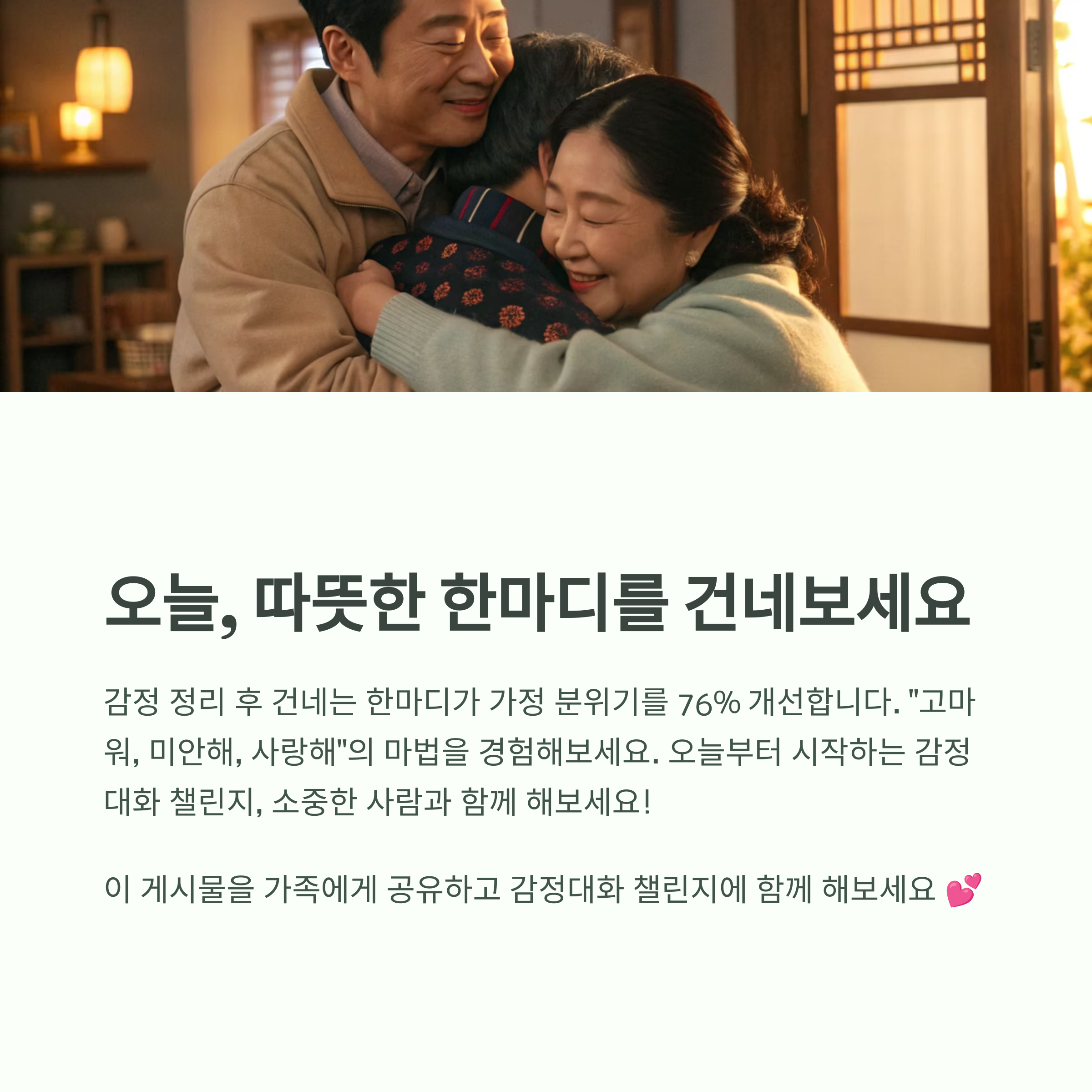 가족 간 감정 조절을 위해 여러분이 실천하는 방법이 있다면 공유해주세요. 누군가에겐 큰 도움이 될 수 있습니다. 함께 나누고 배우며 따뜻한 소통을 이어가요.