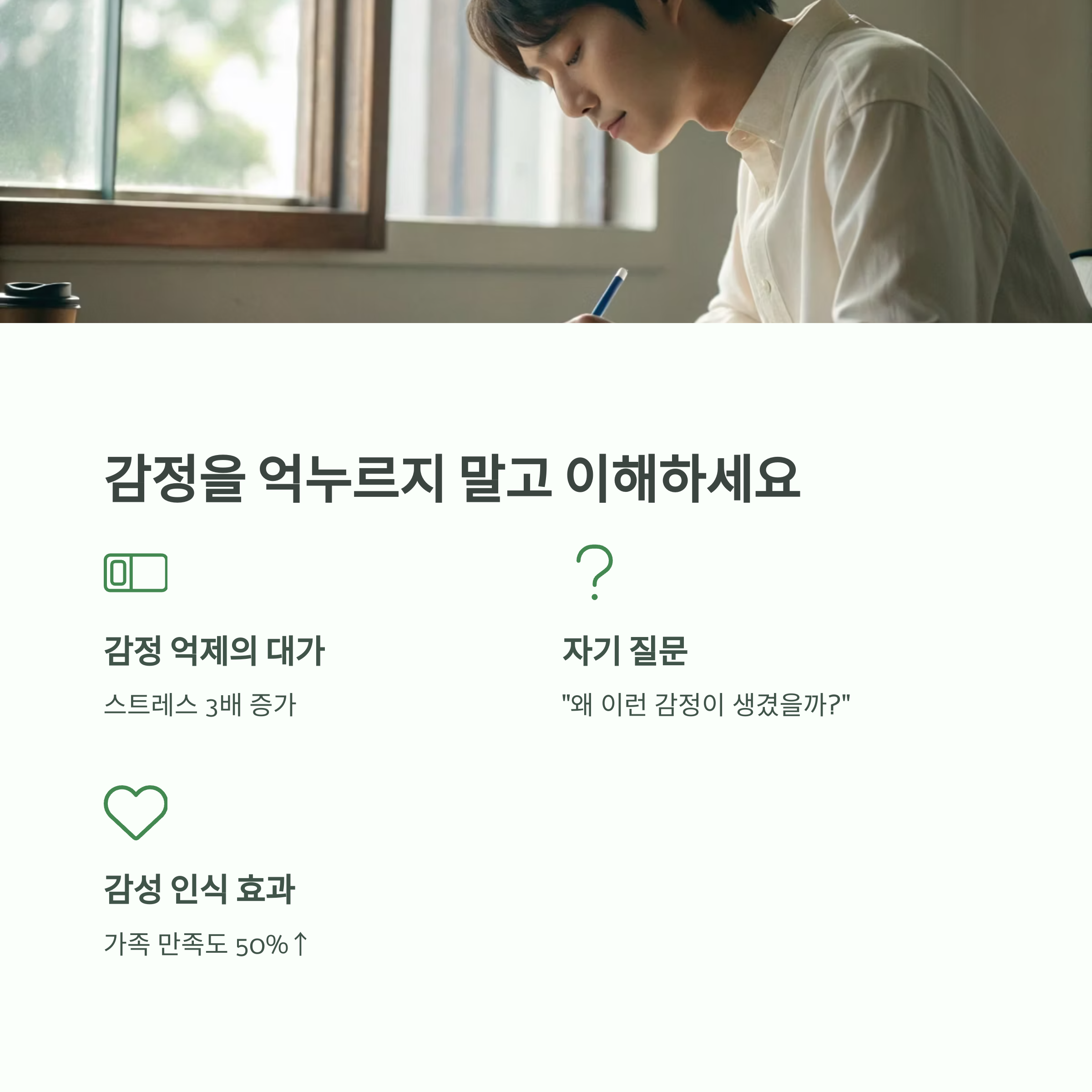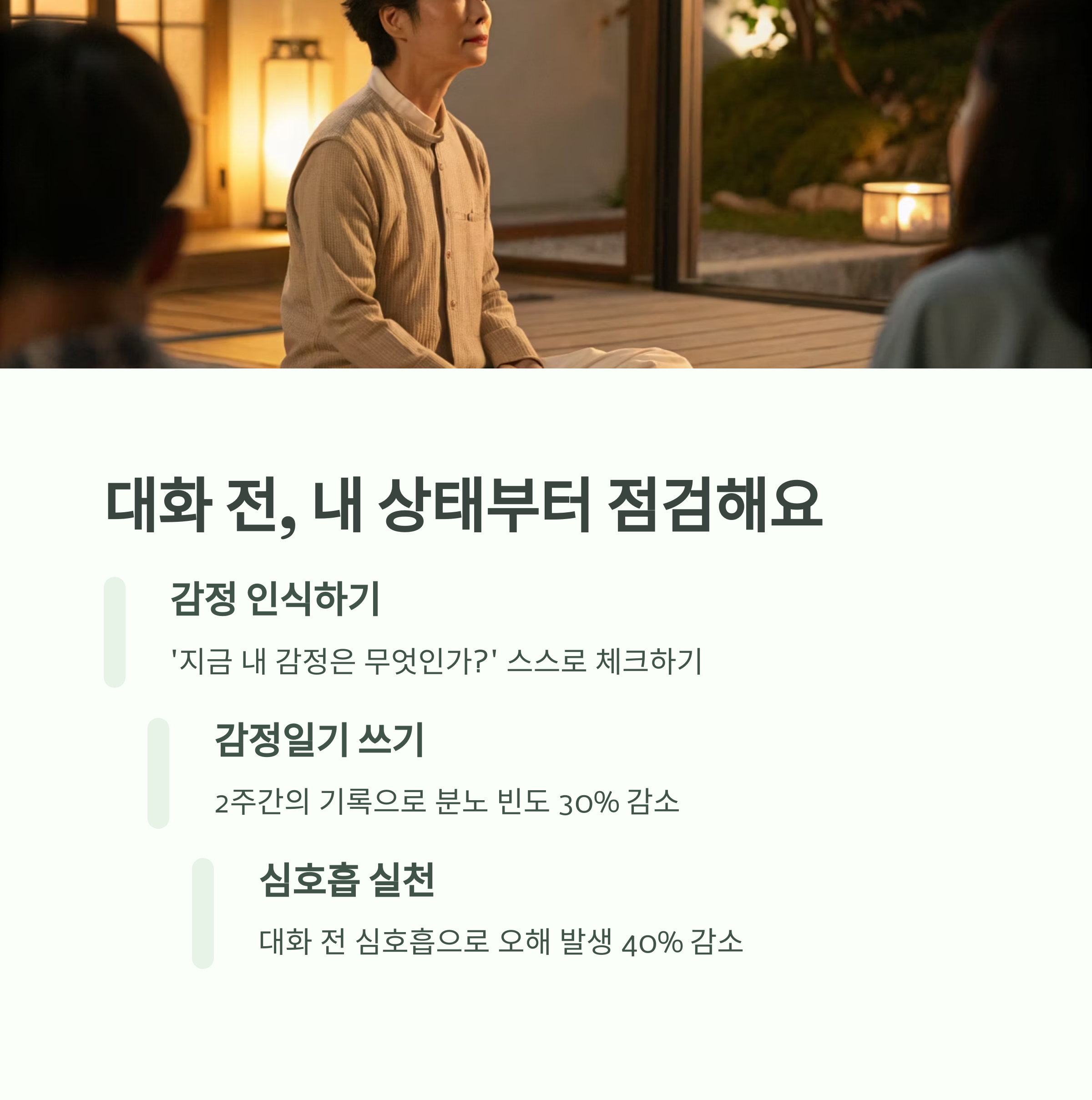 | 하루 한 번 감정 상태 기록하기 | 말하기 전 심호흡과 문장 정리하기 | 서로의 입장을 들을 시간 갖기 |