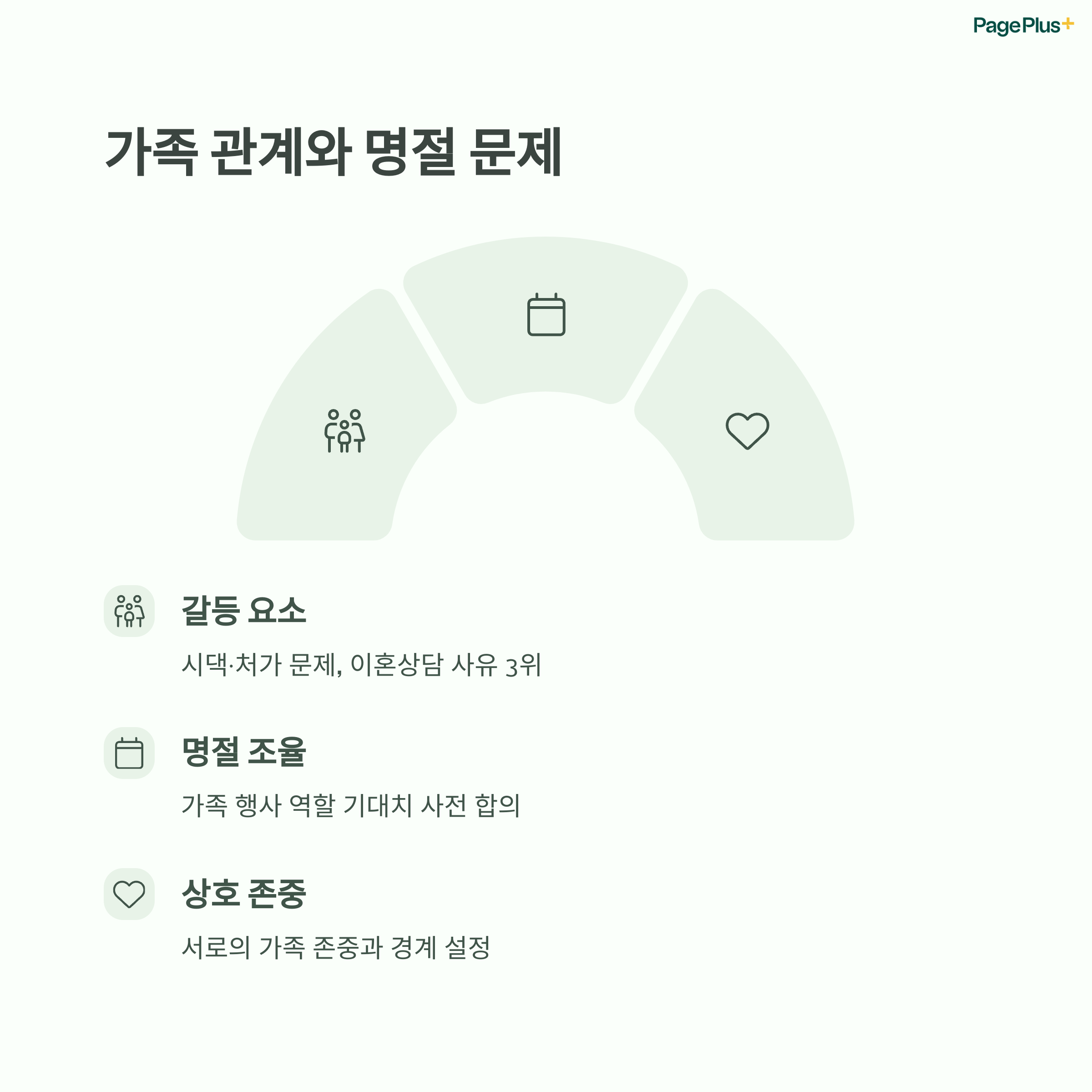 | 수입과 지출의 계획, 소비 습관 등을 공유합니다. | 아이를 원하는 시기, 교육 방향 등을 나눕니다. | 양가와의 거리감 조절과 명절 방문 등을 논의합니다. |