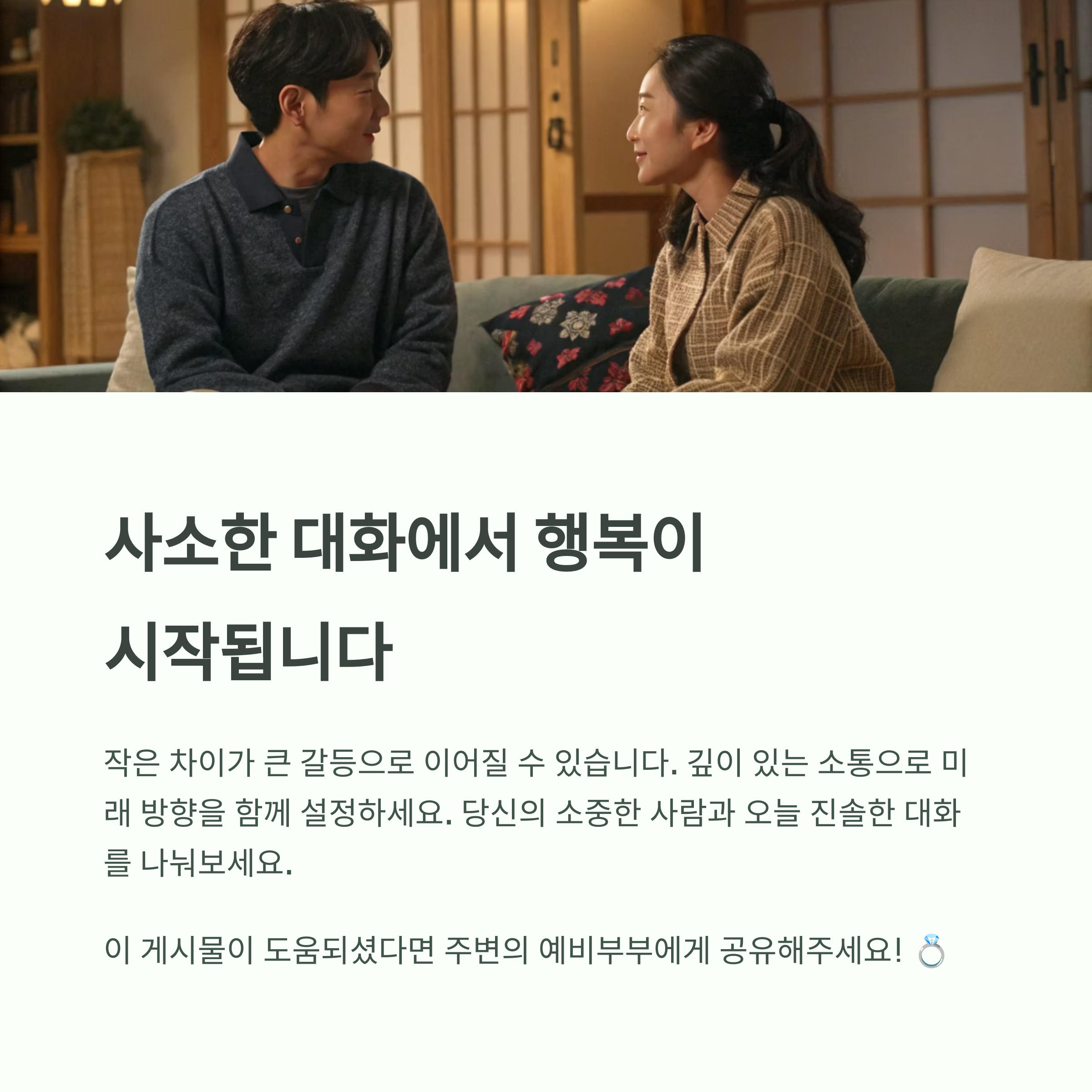 여러분은 결혼 전에 어떤 주제를 꼭 논의해야 한다고 생각하시나요? 댓글로 다양한 의견과 경험을 공유해 주세요. 서로에게 큰 도움이 되는 소통의 장이 되었으면 합니다.