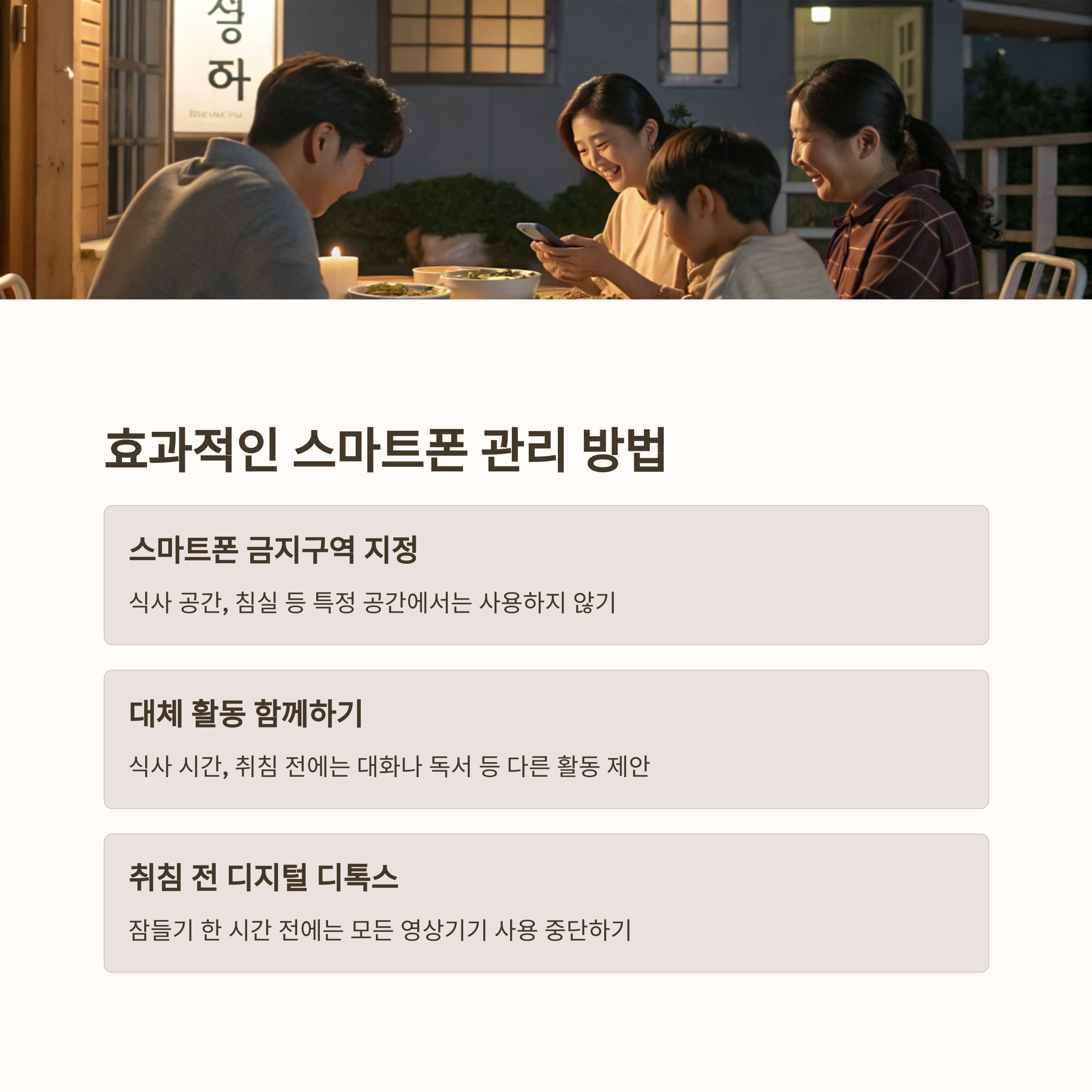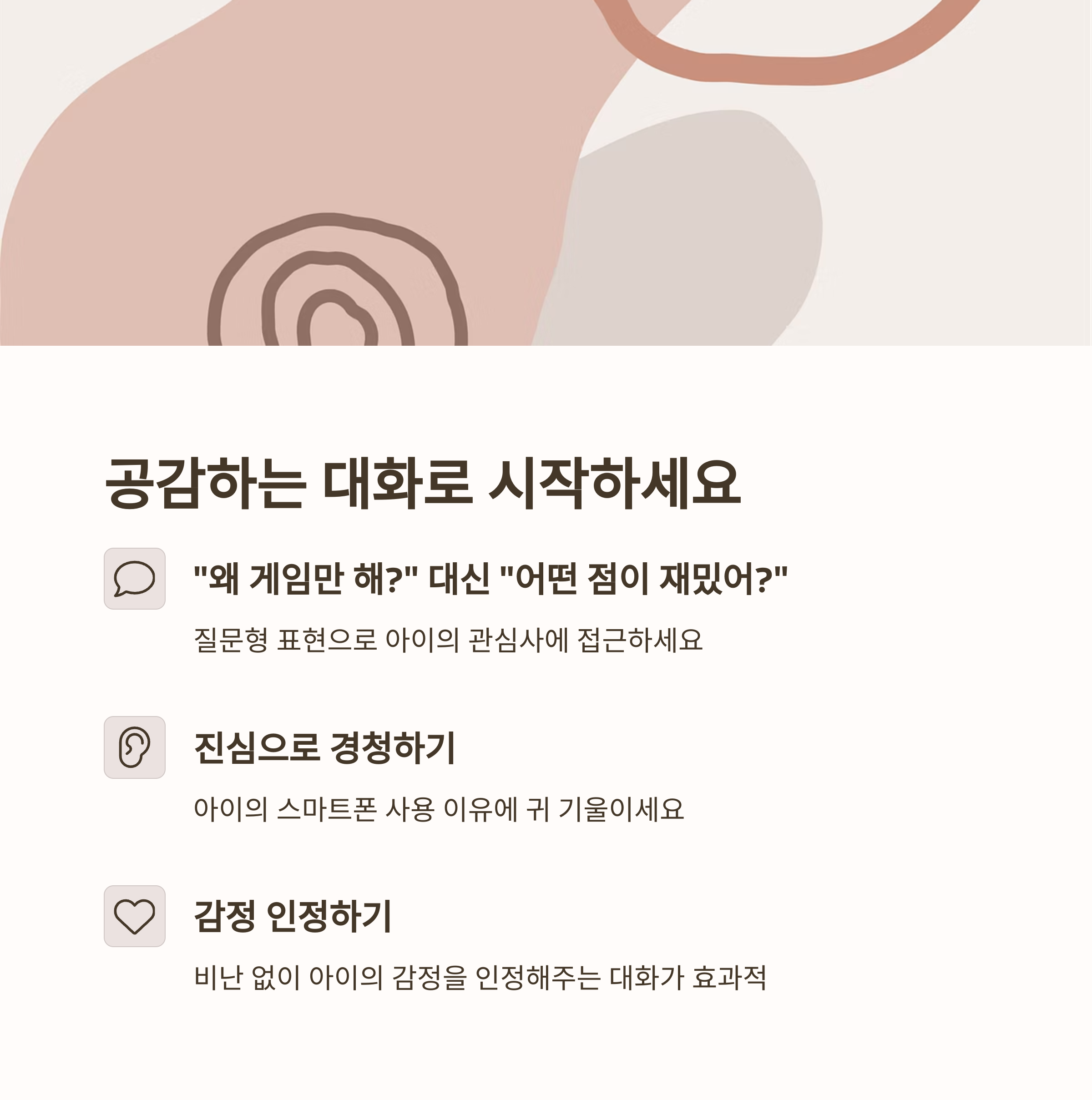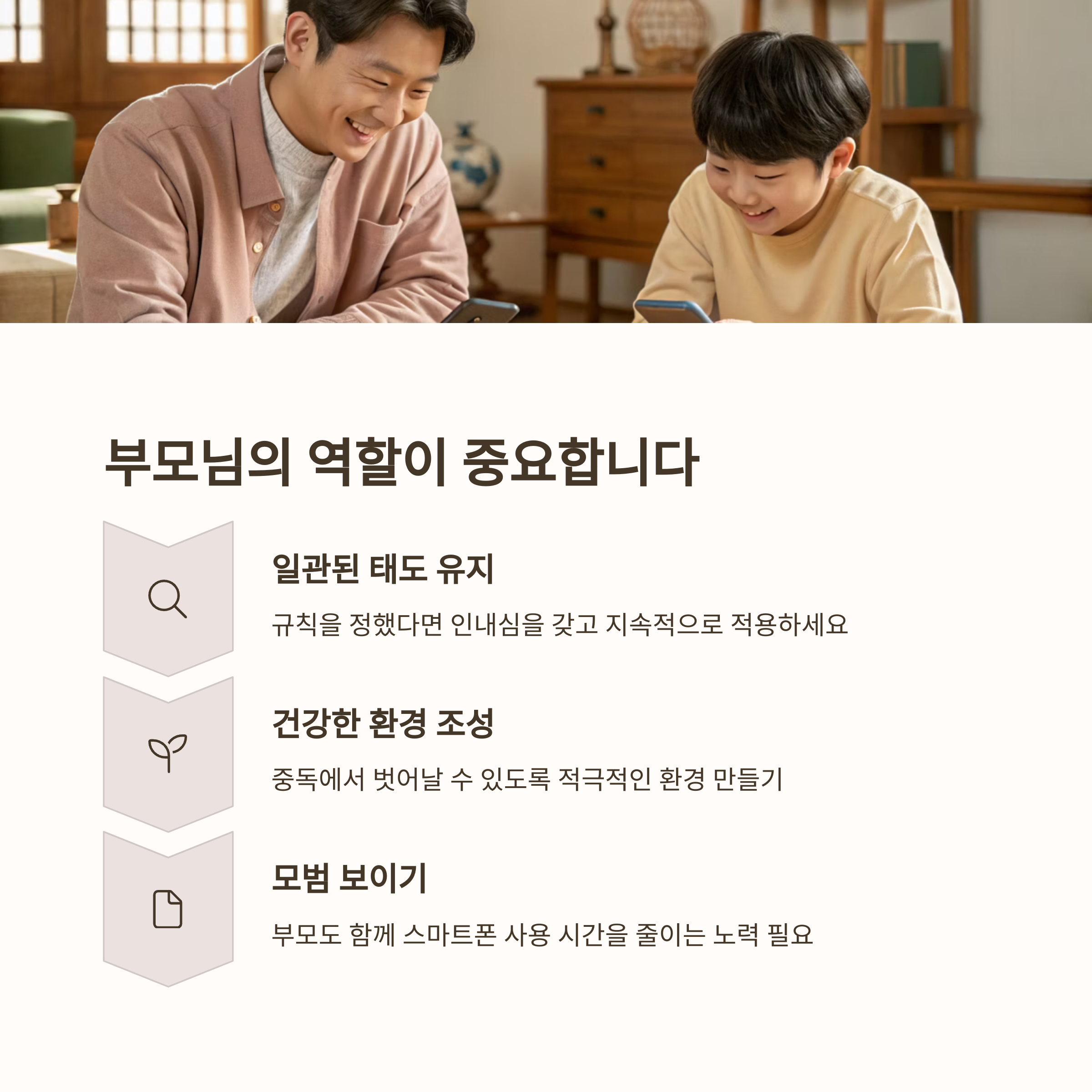 | 사용 시간 기록, 대체 활동 제안 등이 효과적입니다. | 감정을 읽고 공감하는 연습이 바탕이 되어야 합니다. | 부모의 스마트폰 사용 습관도 함께 점검해보세요. |