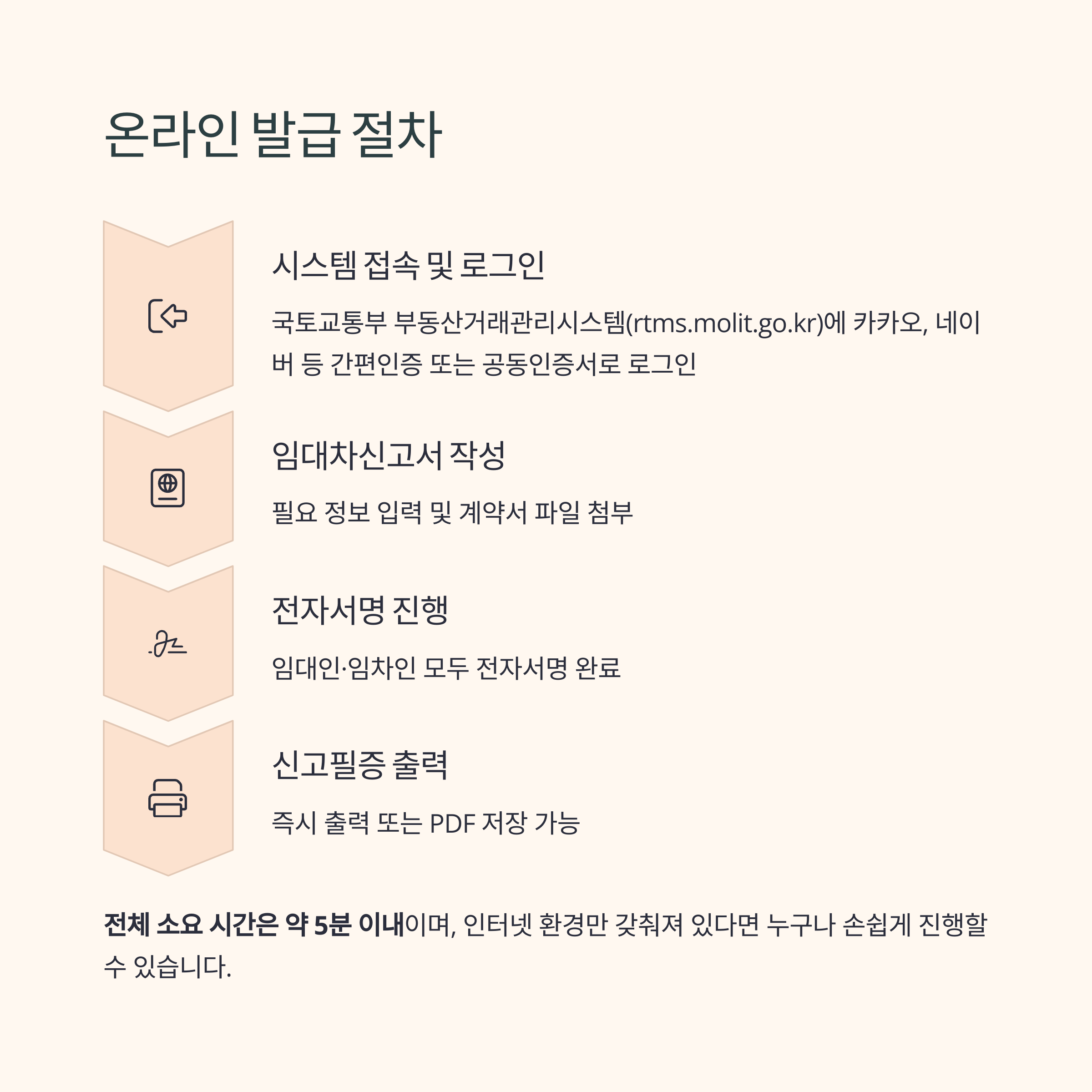 국토교통부 시스템에서 간편 인증 후 계약서 및 정보 입력 → 전자서명 → 즉시 필증 출력까지 5분 이내에 온라인 발급이 가능합니다.