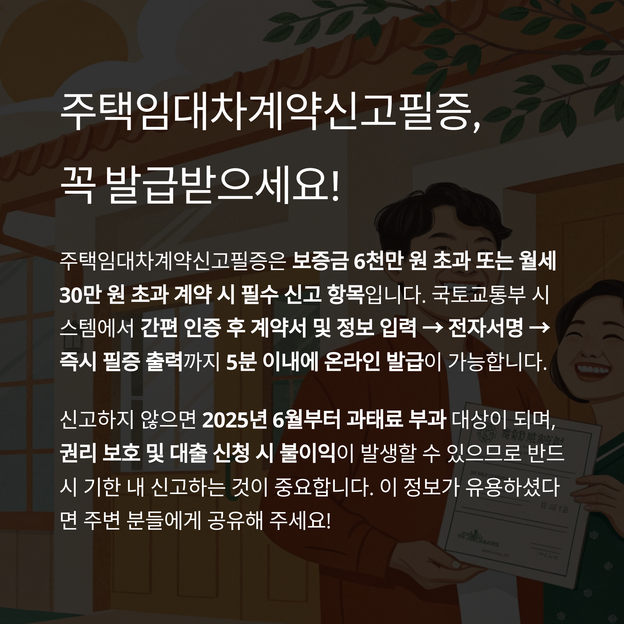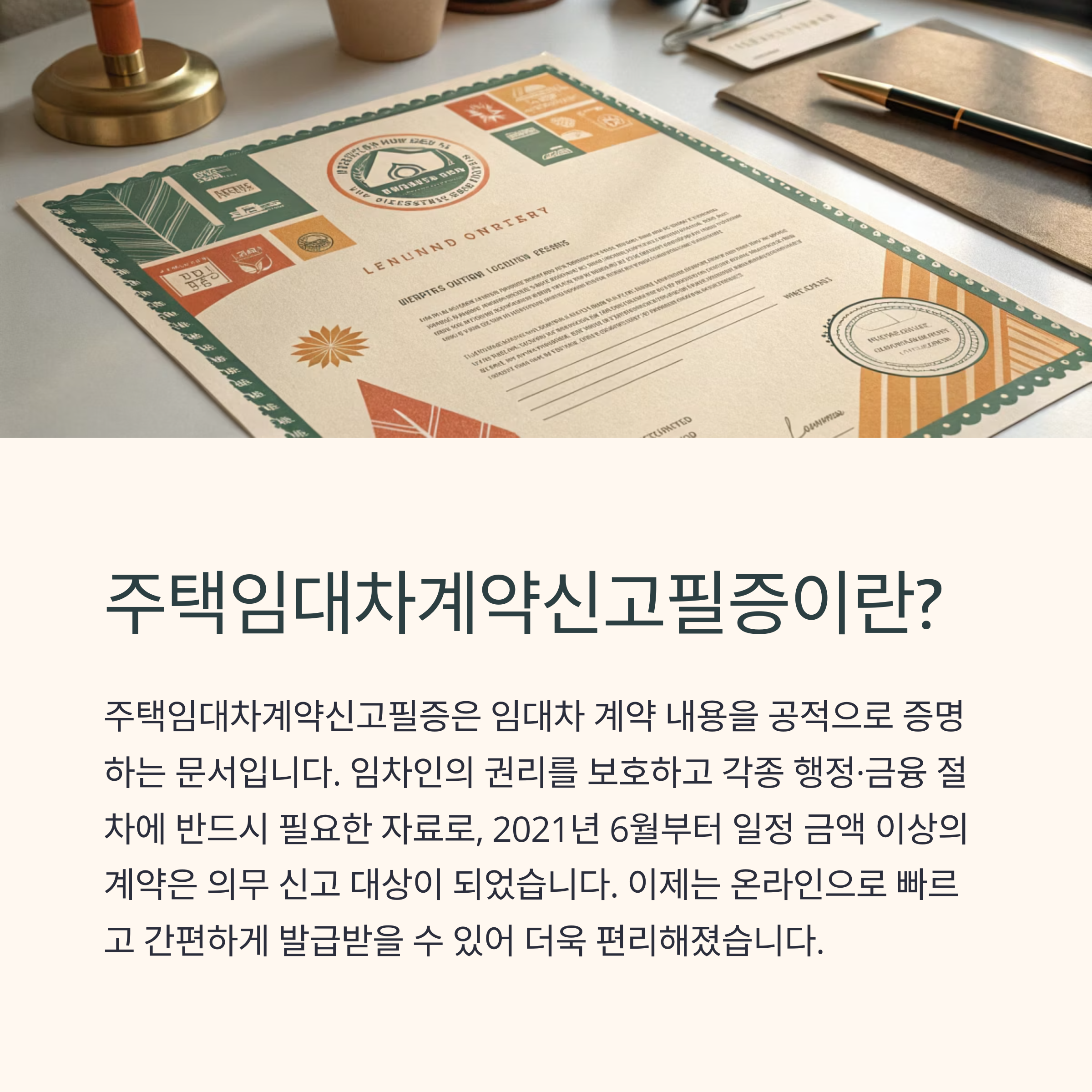 주택임대차계약신고필증은 임대차 계약 내용을 공적으로 증명하는 문서로, 임차인의 권리를 보호하고 각종 행정·금융 절차에 반드시 필요한 자료입니다.