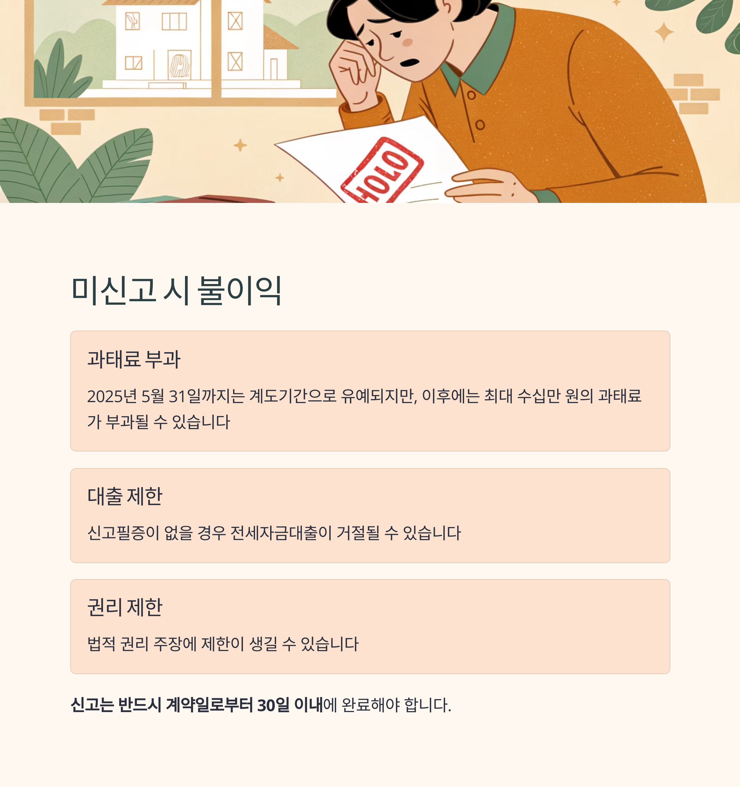 신고하지 않으면 2025년 6월부터 과태료 부과 대상이 되며, 권리 보호 및 대출 신청 시 불이익이 발생할 수 있으므로 반드시 기한 내 신고하는 것이 중요합니다.