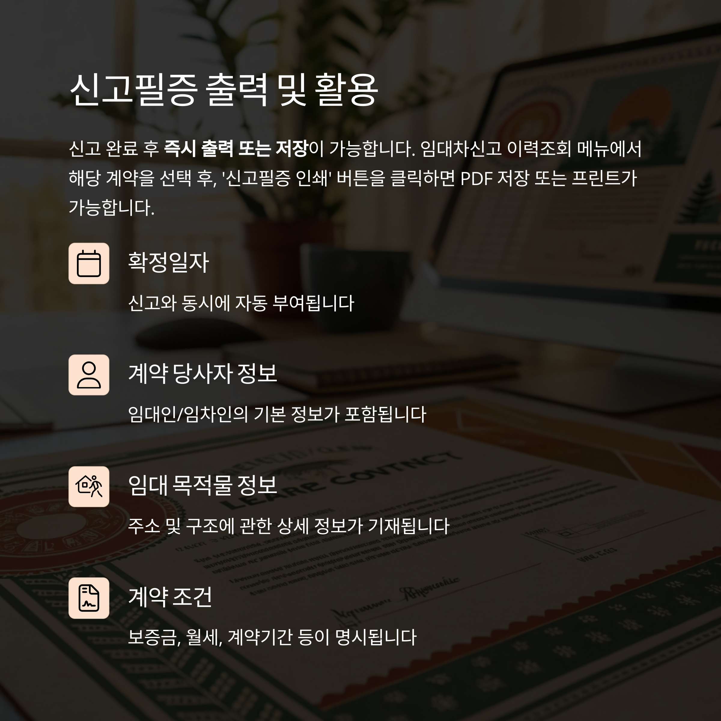 임대차신고 이력조회 메뉴에서 해당 계약을 선택 후, ‘신고필증 인쇄’ 버튼을 클릭하면 PDF 저장 또는 프린트가 가능합니다.