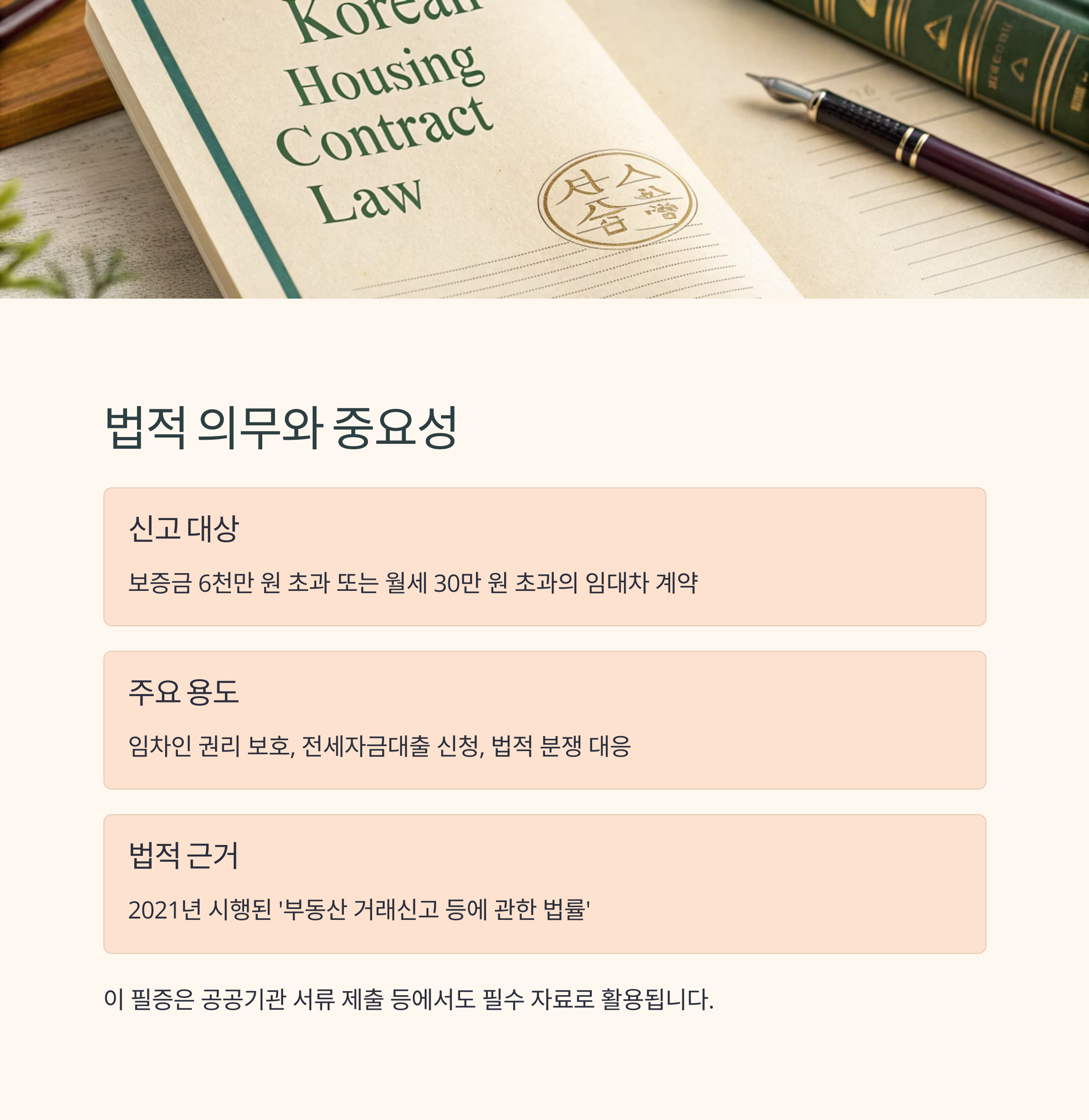 2021년 시행된 '부동산 거래신고 등에 관한 법률'에 따라, 보증금 6천만 원 초과 또는 월세 30만 원 초과의 임대차 계약은 반드시 신고해야 합니다.