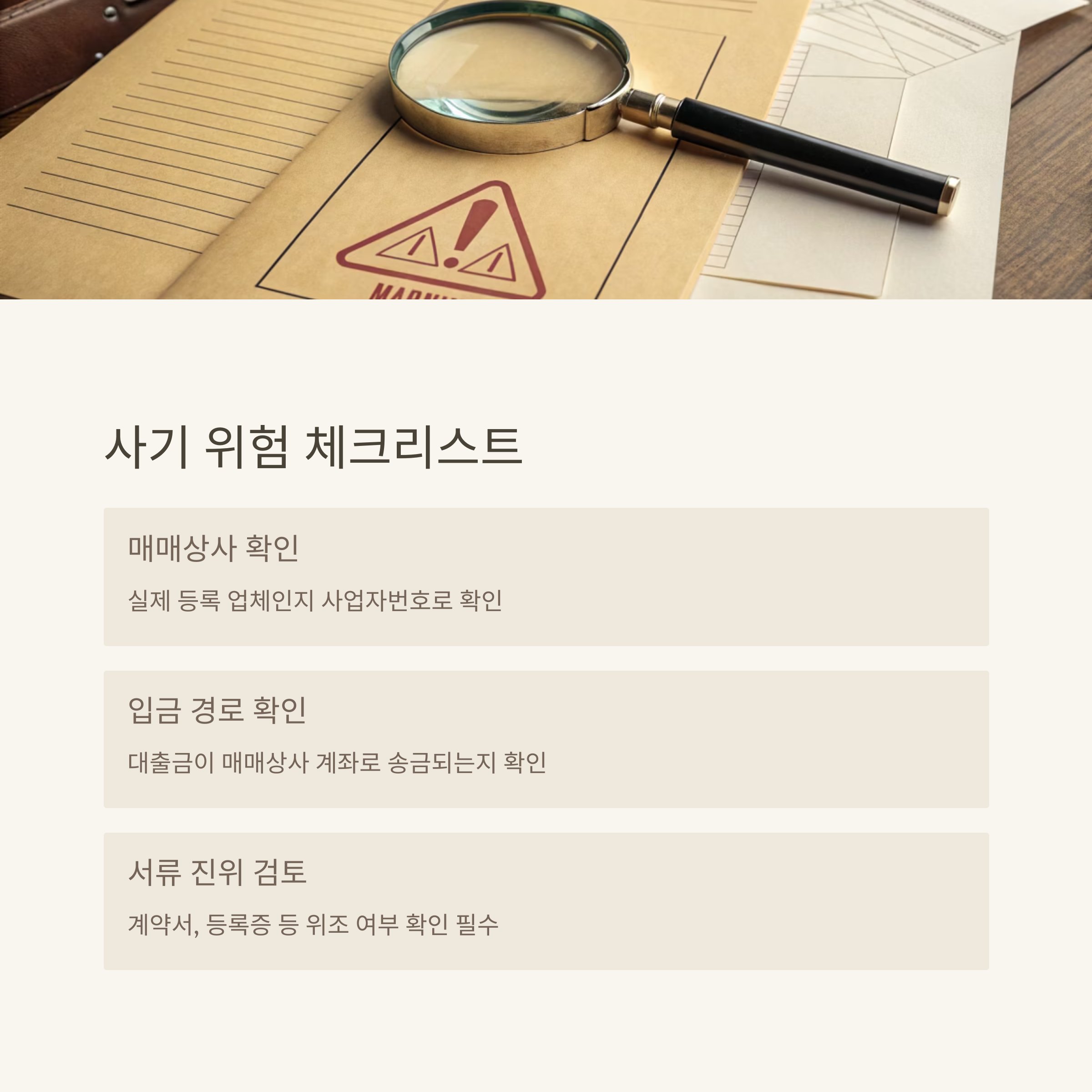 | 대출금 입금 경로 | 판매자가 아닌 매매상사 계좌로 송금되는지 확인 |