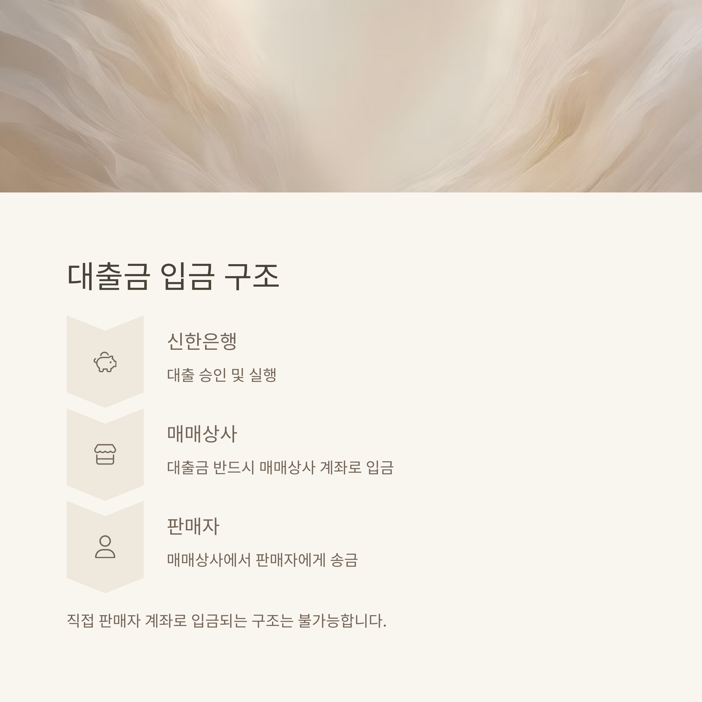 신한은행 시스템상 대출금은 반드시 공식 매매상사 계좌로 입금되어야 하며, 직접 판매자 계좌로 돈이 들어가는 구조는 허용되지 않습니다.