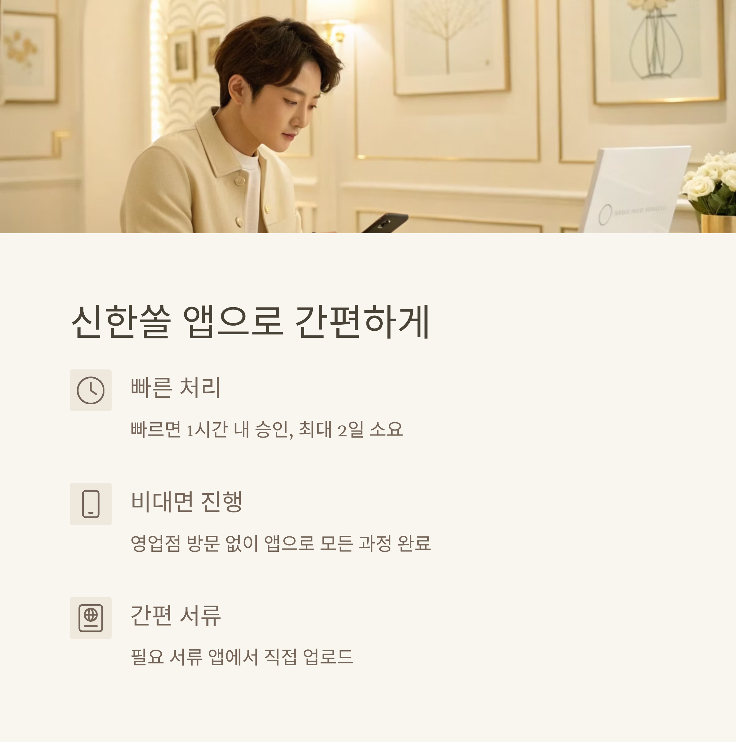 신한쏠(SOL) 앱을 통해 대출 신청부터 실행까지 전 과정 비대면 진행이 가능합니다.