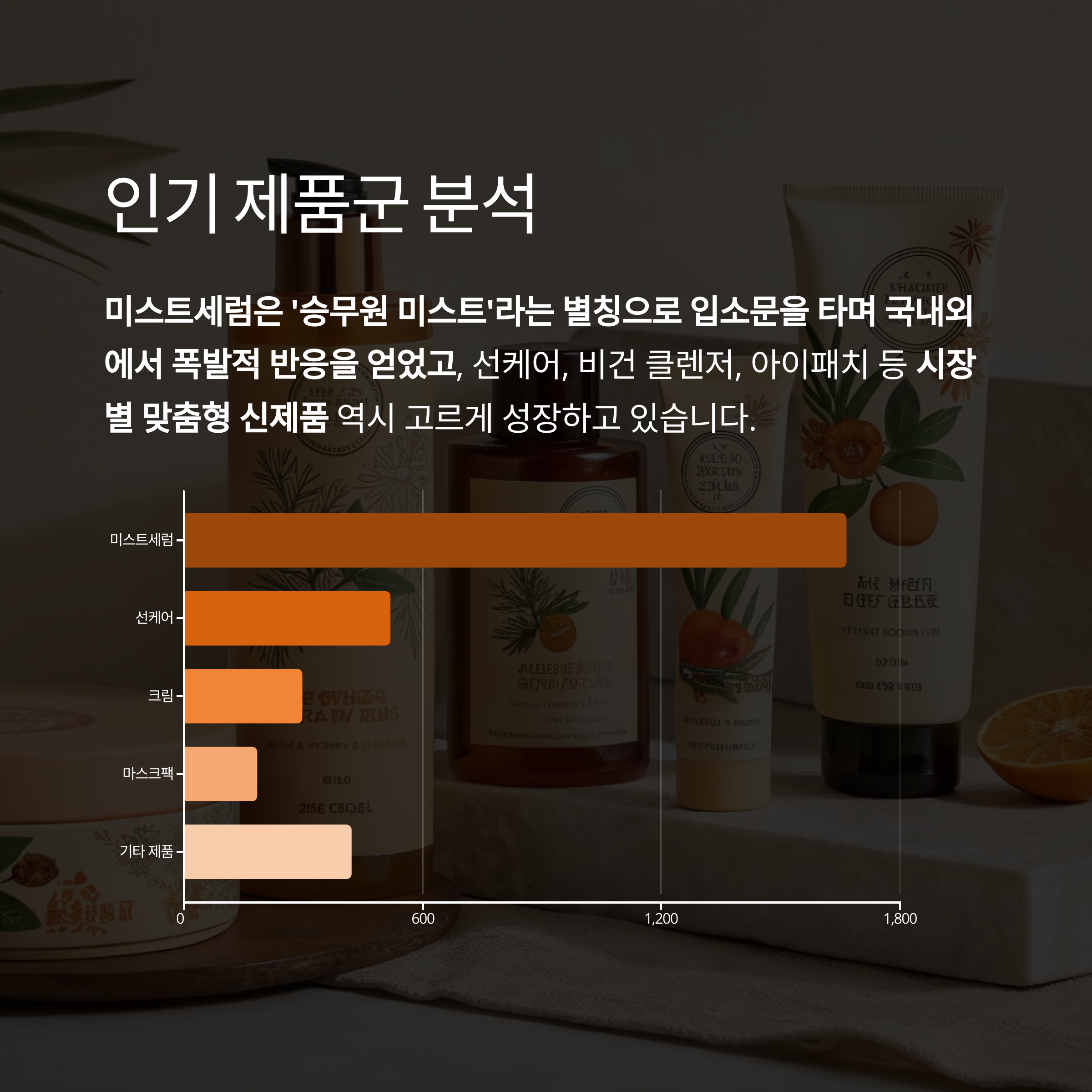 미스트세럼은 ‘승무원 미스트’라는 별칭으로 입소문을 타며 국내외에서 폭발적 반응을 얻었고, 선케어, 비건 클렌저, 아이패치 등 시장별 맞춤형 신제품 역시 고르게 성장하고 있습니다.