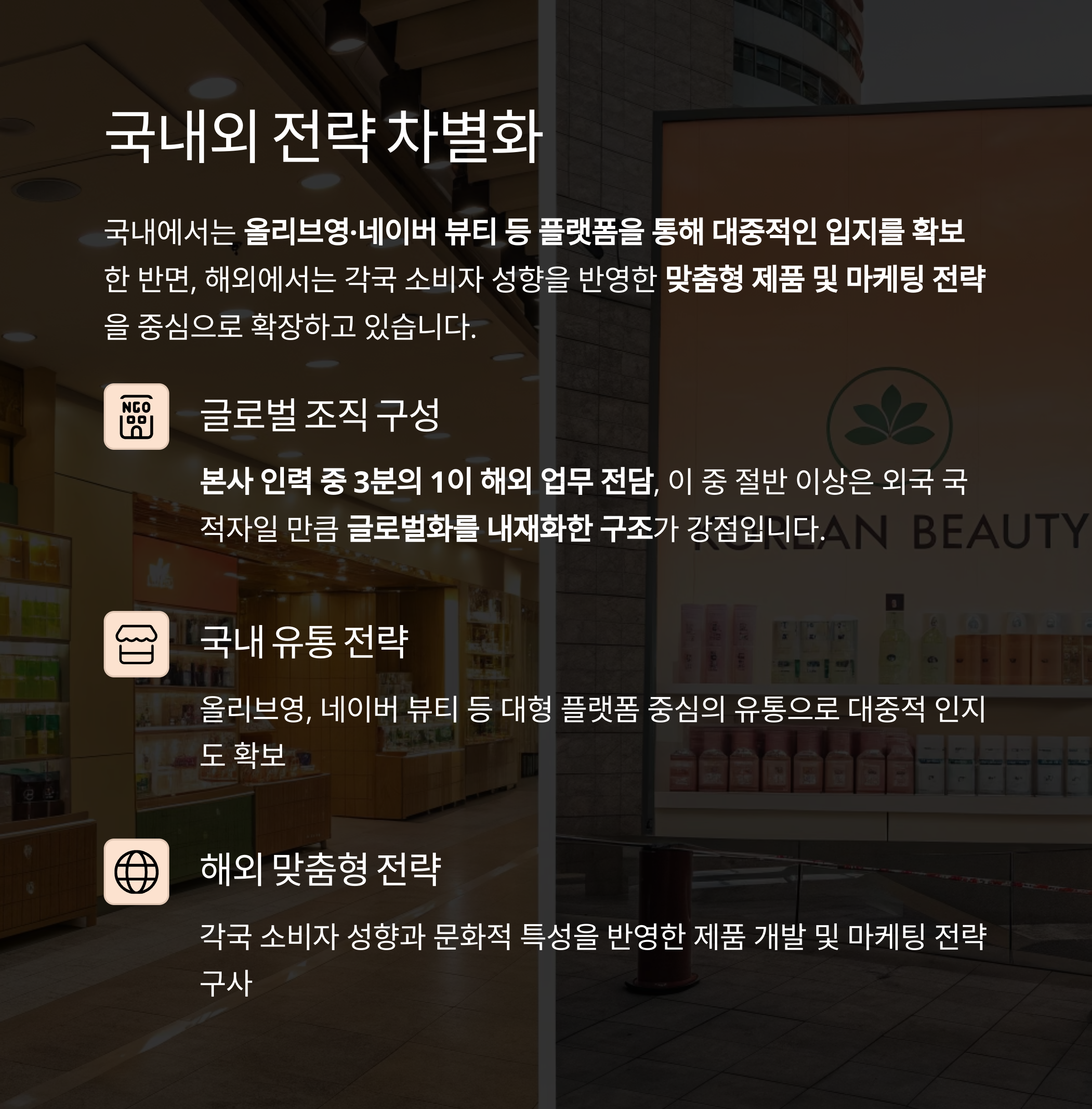 국내에서는 올리브영·네이버 뷰티 등 플랫폼을 통해 대중적인 입지를 확보한 반면, 해외에서는 각국 소비자 성향을 반영한 맞춤형 제품 및 마케팅 전략을 중심으로 확장하고 있습니다.