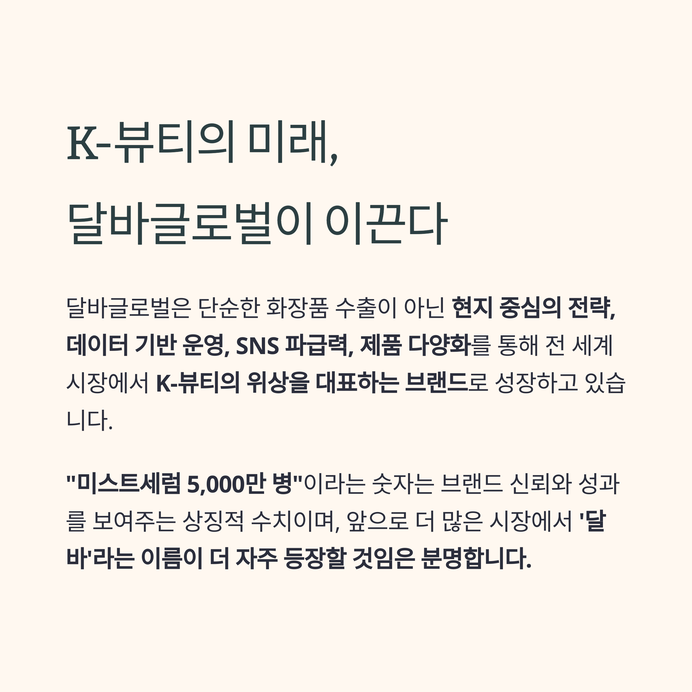 달바글로벌은 단순한 화장품 수출이 아닌 현지 중심의 전략, 데이터 기반 운영, SNS 파급력, 제품 다양화를 통해 전 세계 시장에서 K-뷰티의 위상을 대표하는 브랜드로 성장하고 있습니다.
