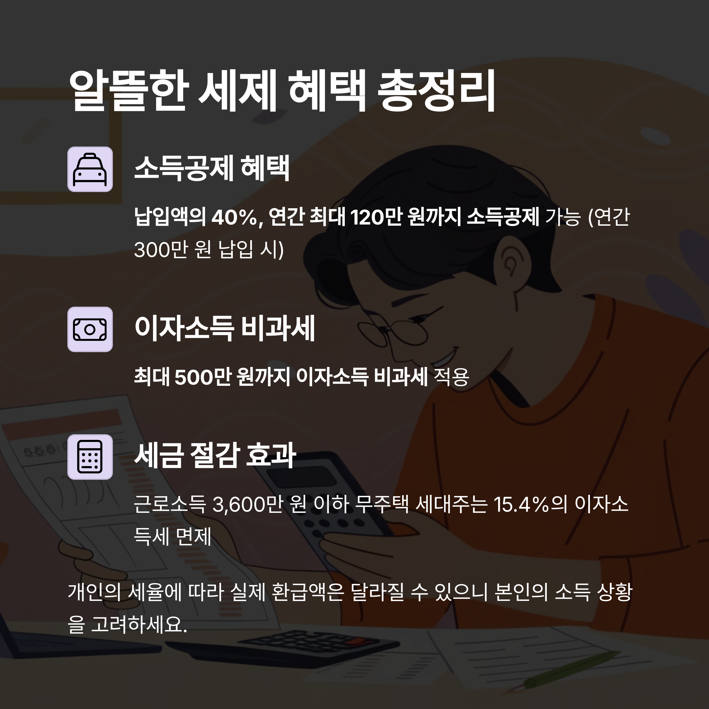 또한, 이자소득 비과세는 최대 500만 원까지 적용되며 근로소득 3,600만 원 이하 무주택 세대주는 15.4%의 이자소득세를 면제받을 수 있습니다.
