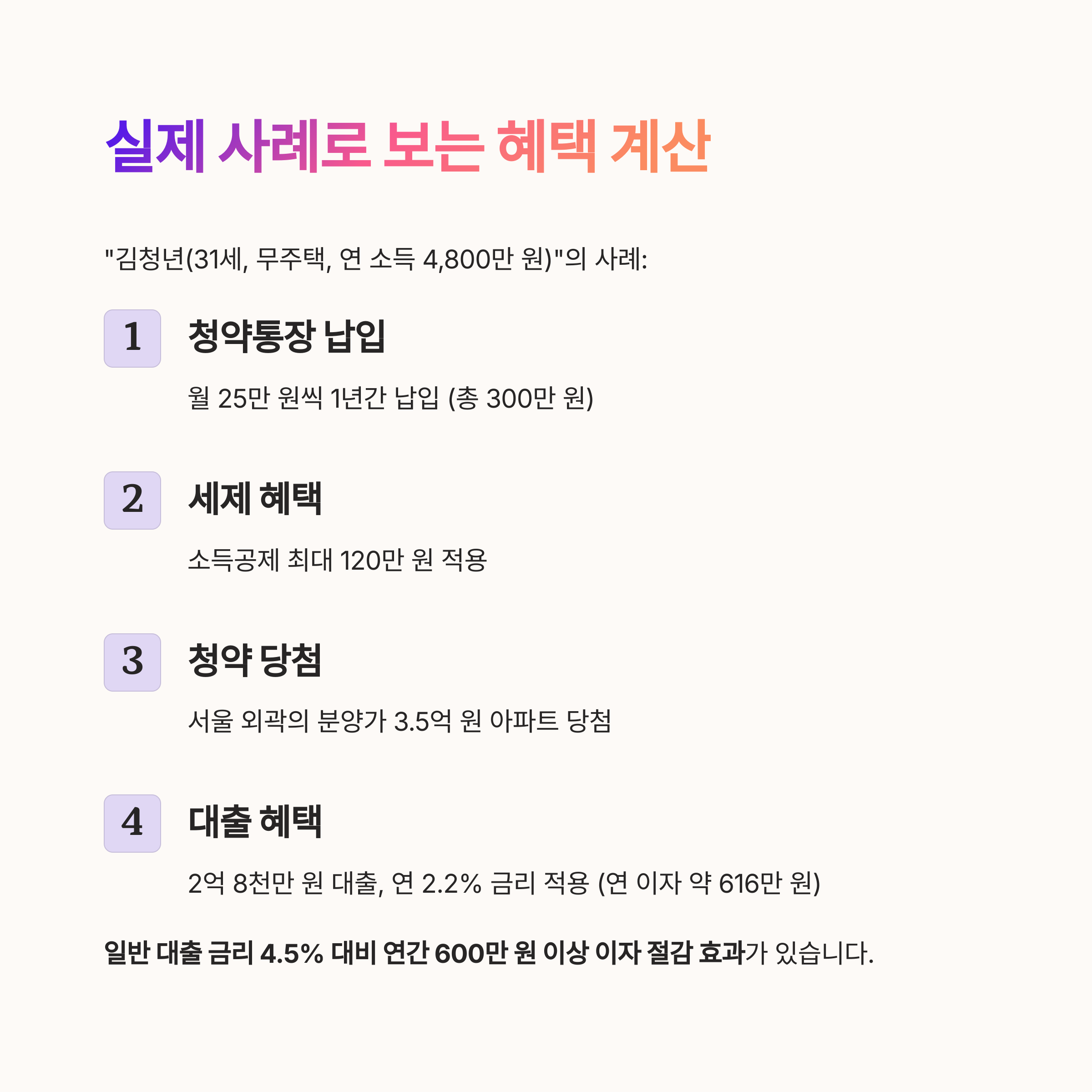 “김청년(31세, 무주택, 연 소득 4,800만 원)”은 청년주택드림청약통장에 월 25만 원씩 1년간 납입하고, 서울 외곽의 분양가 3.5억 원 아파트에 당첨됐습니다.
