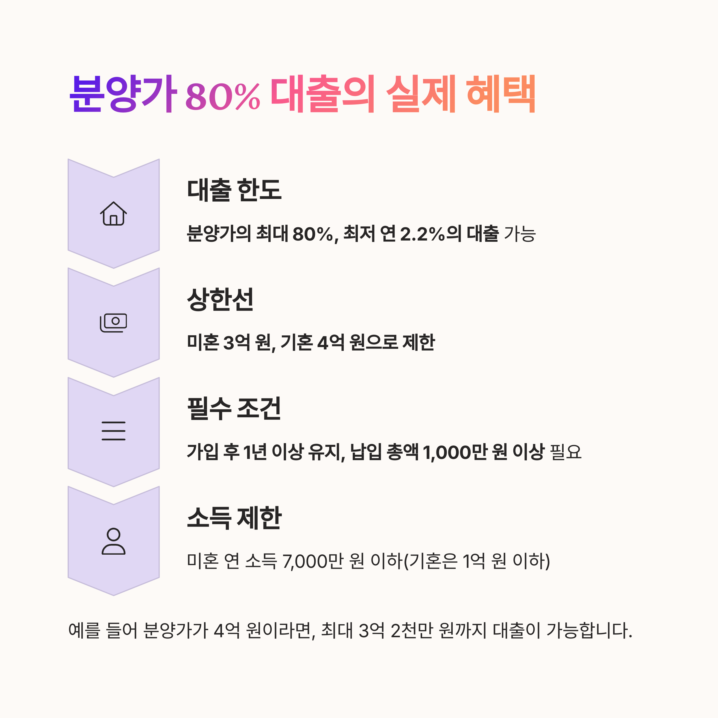 예를 들어 분양가가 4억 원이라면, 최대 3억 2천만 원까지 대출이 가능합니다.