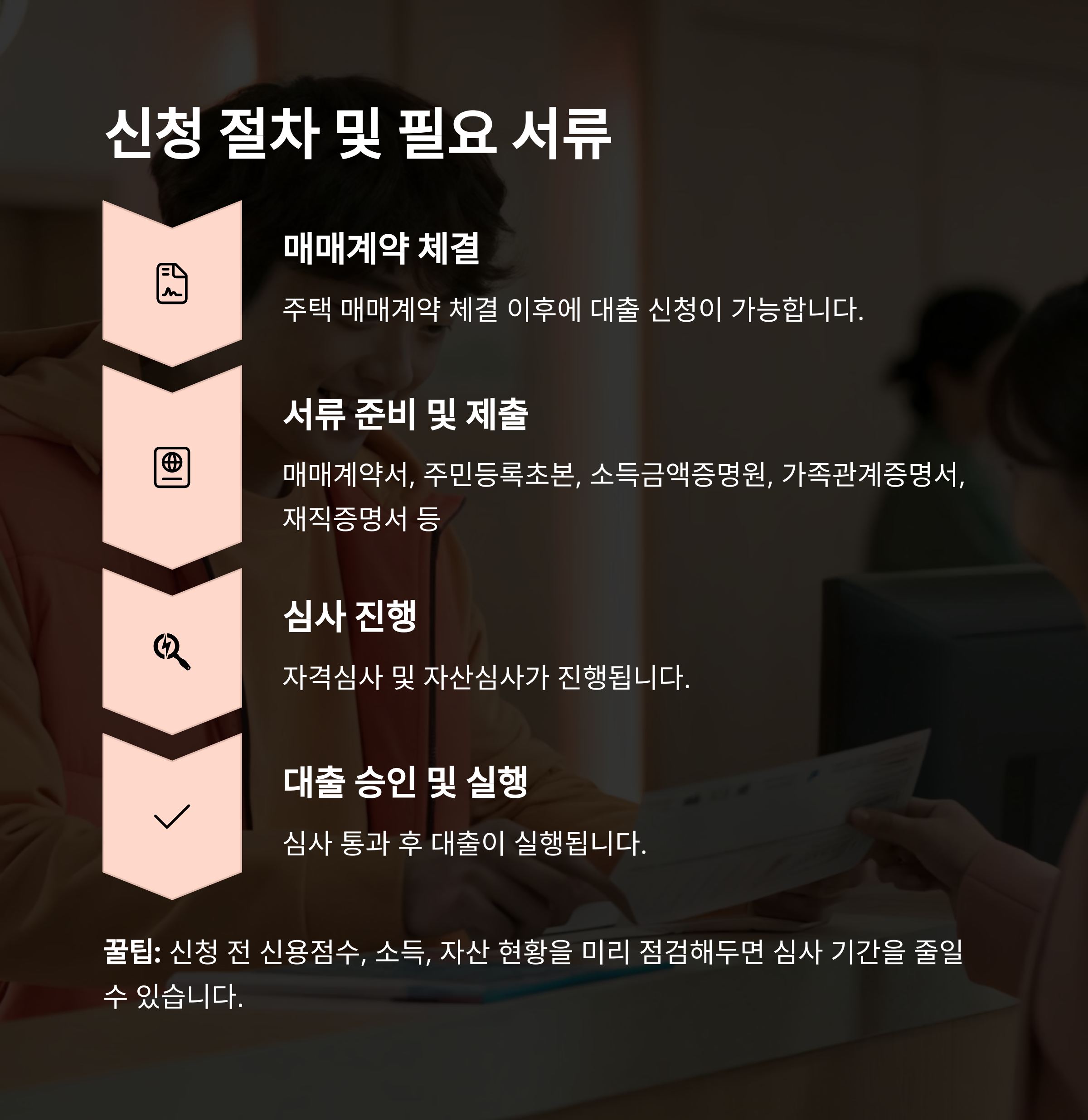 기금e든든 또는 시중 은행 창구를 통해 접수 대출 신청은 주택 매매계약 체결 이후에 가능합니다.