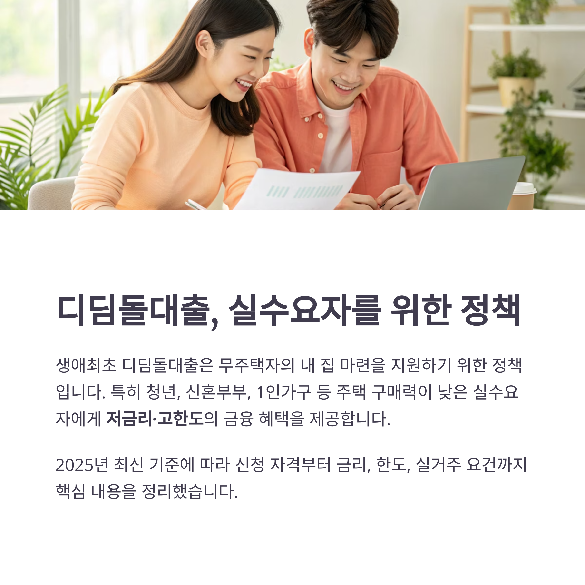 생애최초 주택 구입자에게 제공되는 디딤돌대출은 저금리와 실거주 요건을 충족하면 최대 3억 원까지 대출 가능한 내 집 마련의 필수 기회입니다.