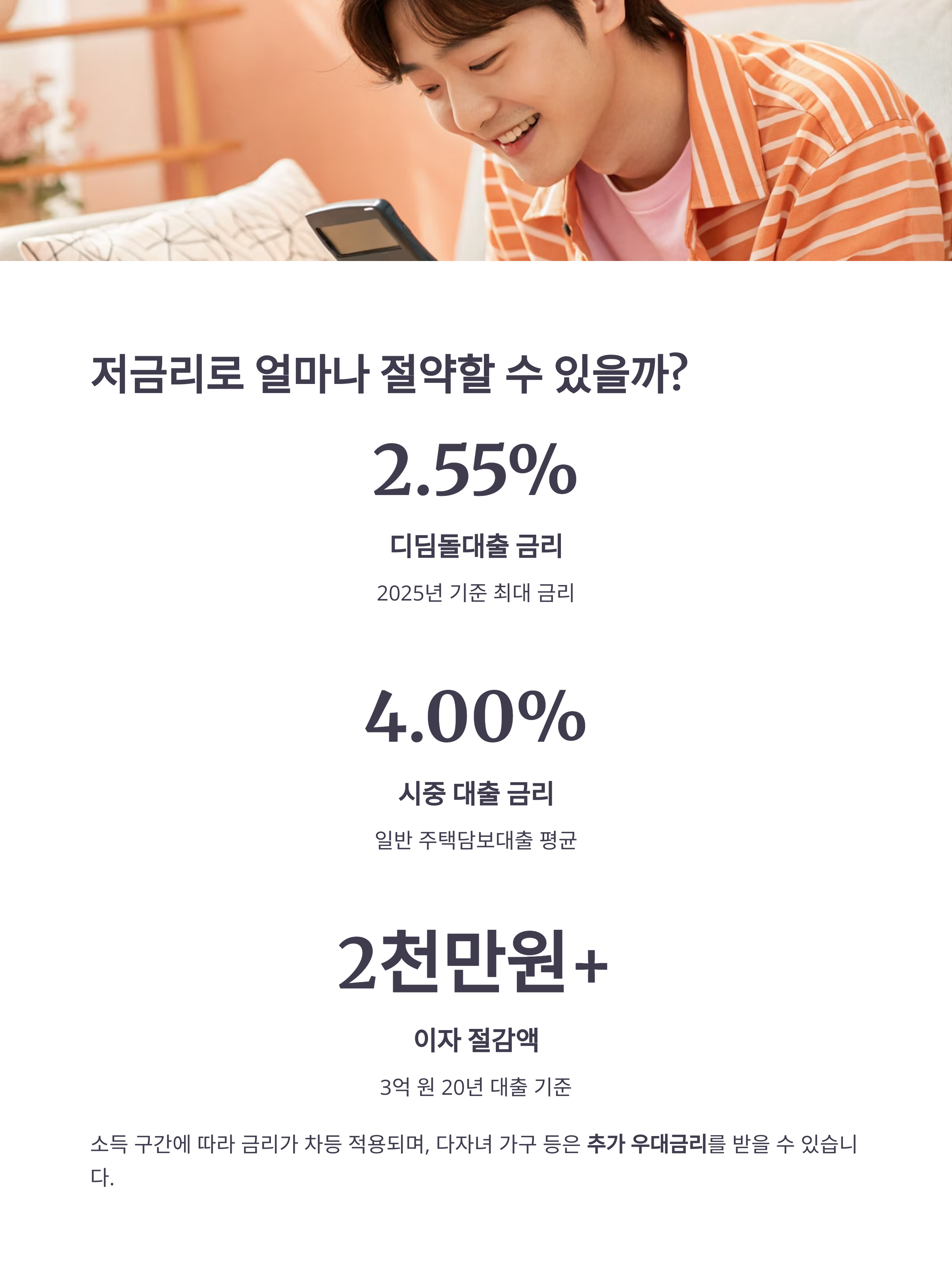 시중 대출보다 최대 수천만 원 이자 절약 2025년 기준 디딤돌대출 금리는 연 2.25%~2.55% 수준입니다.