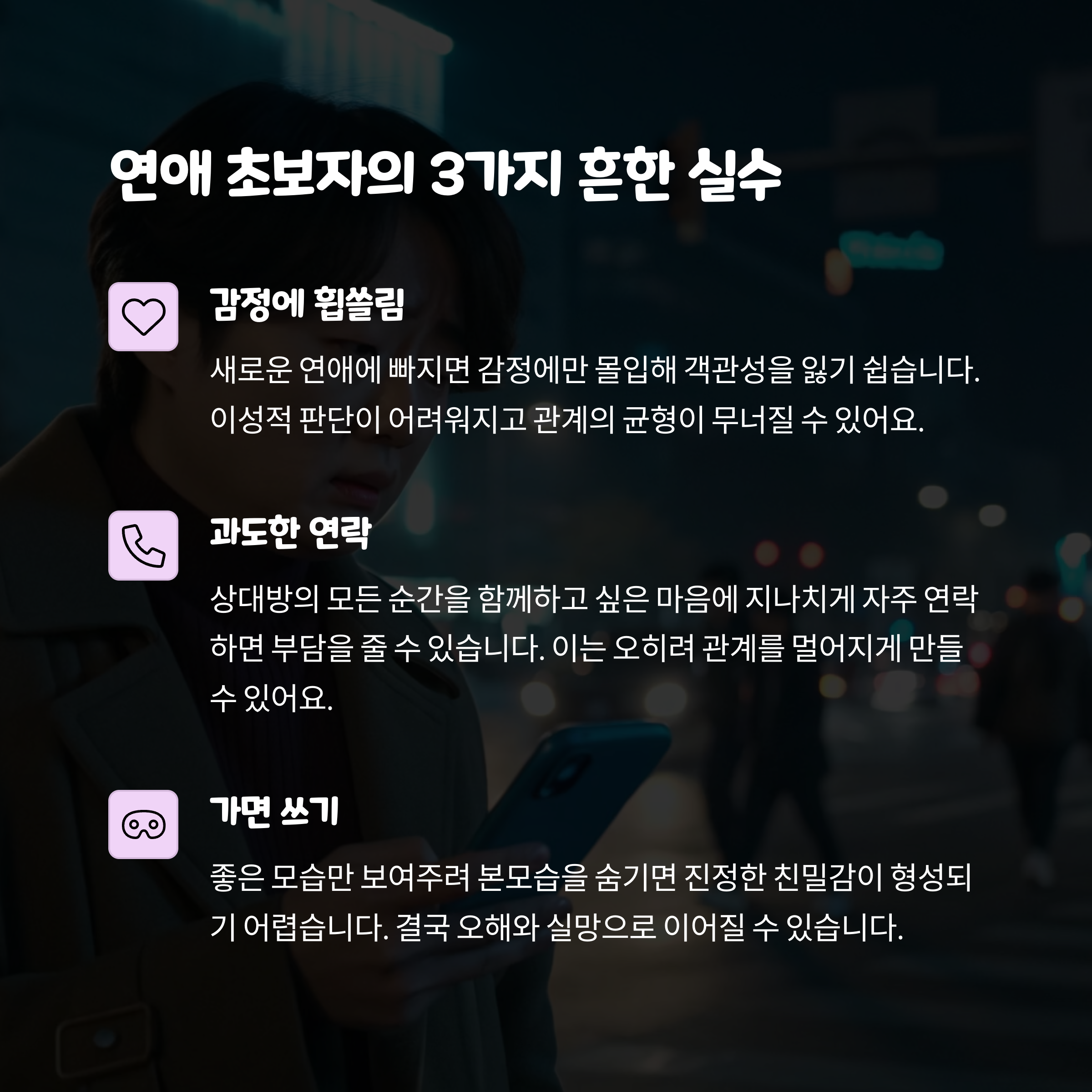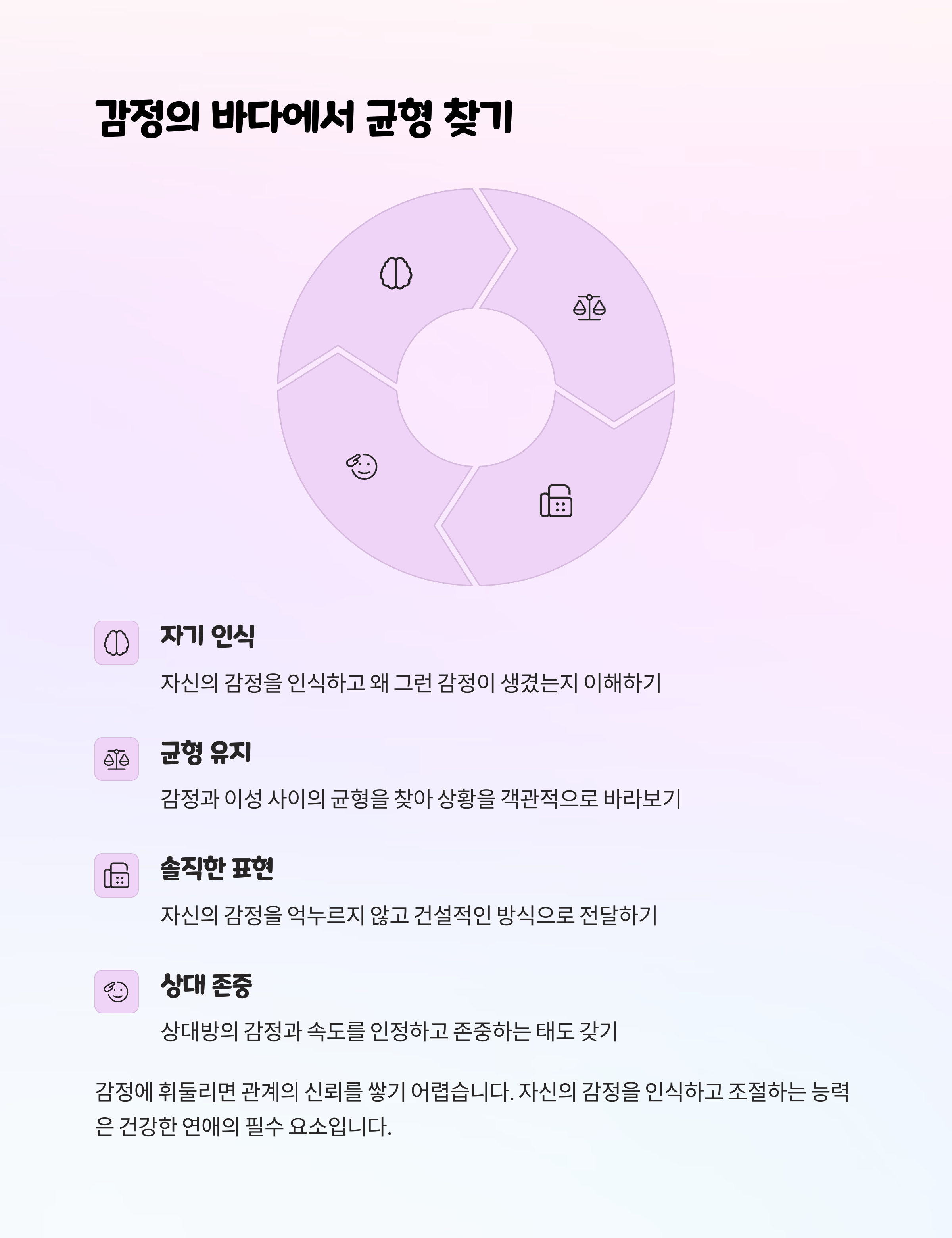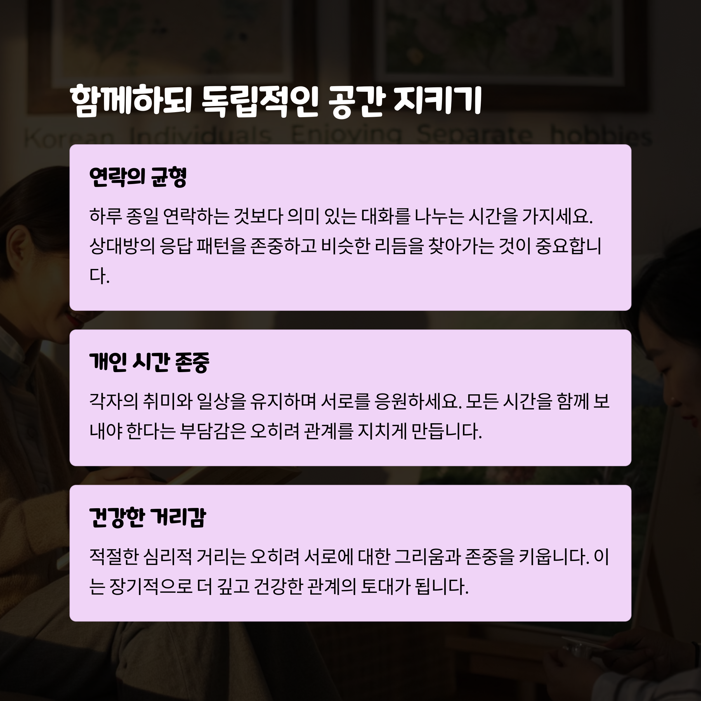 | 혼자 오해하고 상처받는 상황 줄이기 | 각자 시간도 소중히 여기는 태도 | 관계의 깊이를 만들어가는 핵심 포인트 |