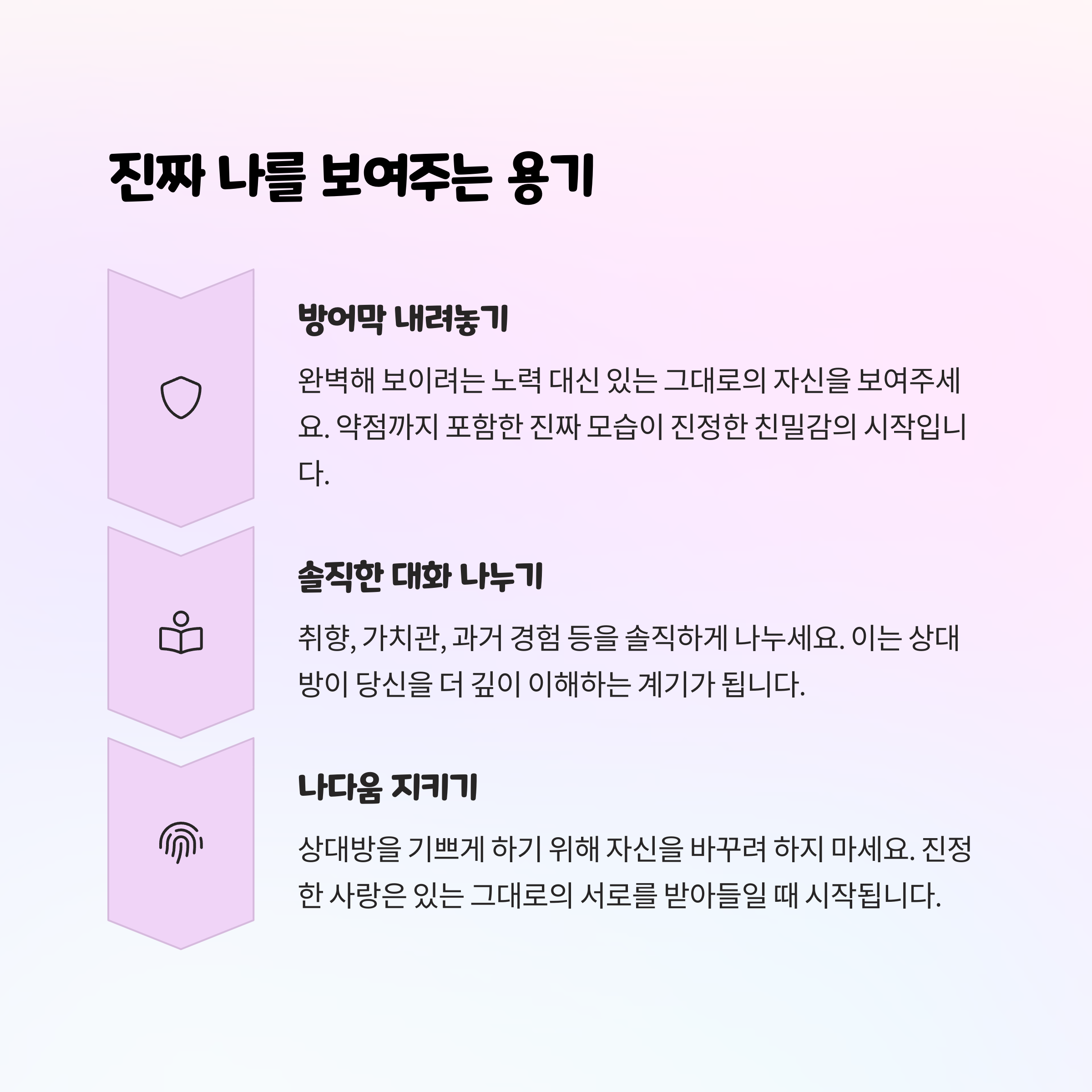 | 상대 입장을 고려하며 감정을 조절하는 법 | 너무 가깝지도, 멀지도 않은 관계 유지 | 진짜 나를 드러내는 연습이 필요 |