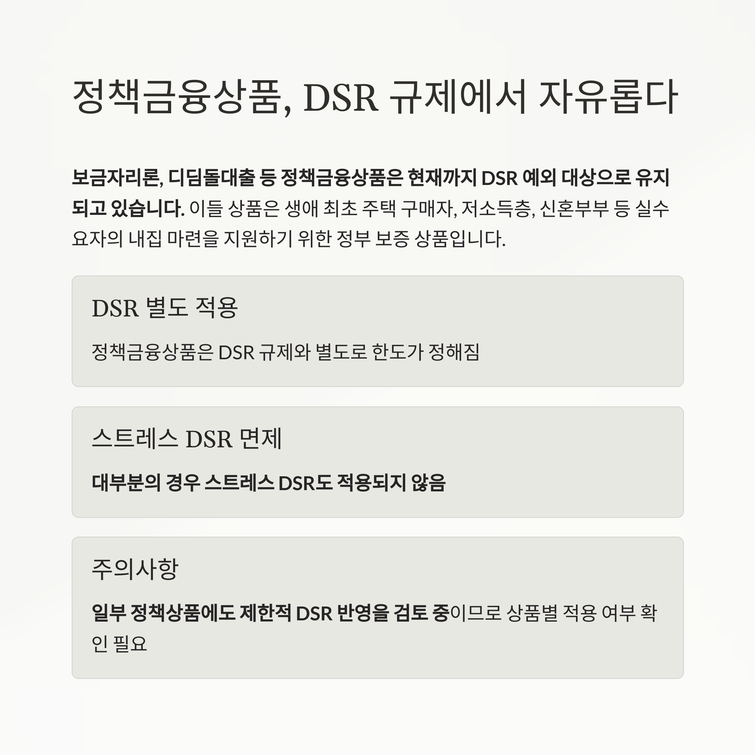 보금자리론, 디딤돌대출 등 정책금융상품은 현재까지 DSR 예외 대상으로 유지되고 있습니다.