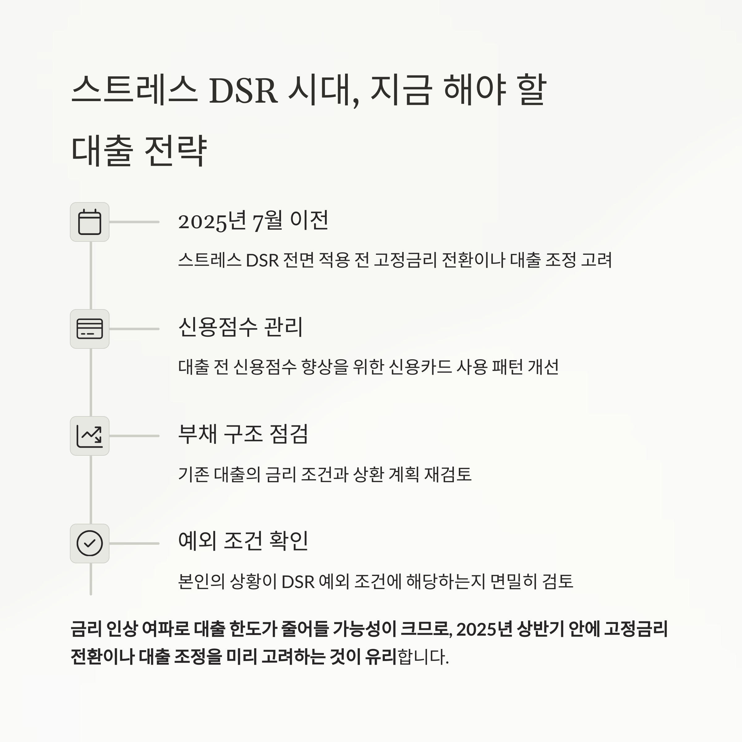 | 스트레스 DSR 시뮬레이션 | 2025년 7월 이후 금리 인상 반영 시 대출 한도 미리 계산 필요 |