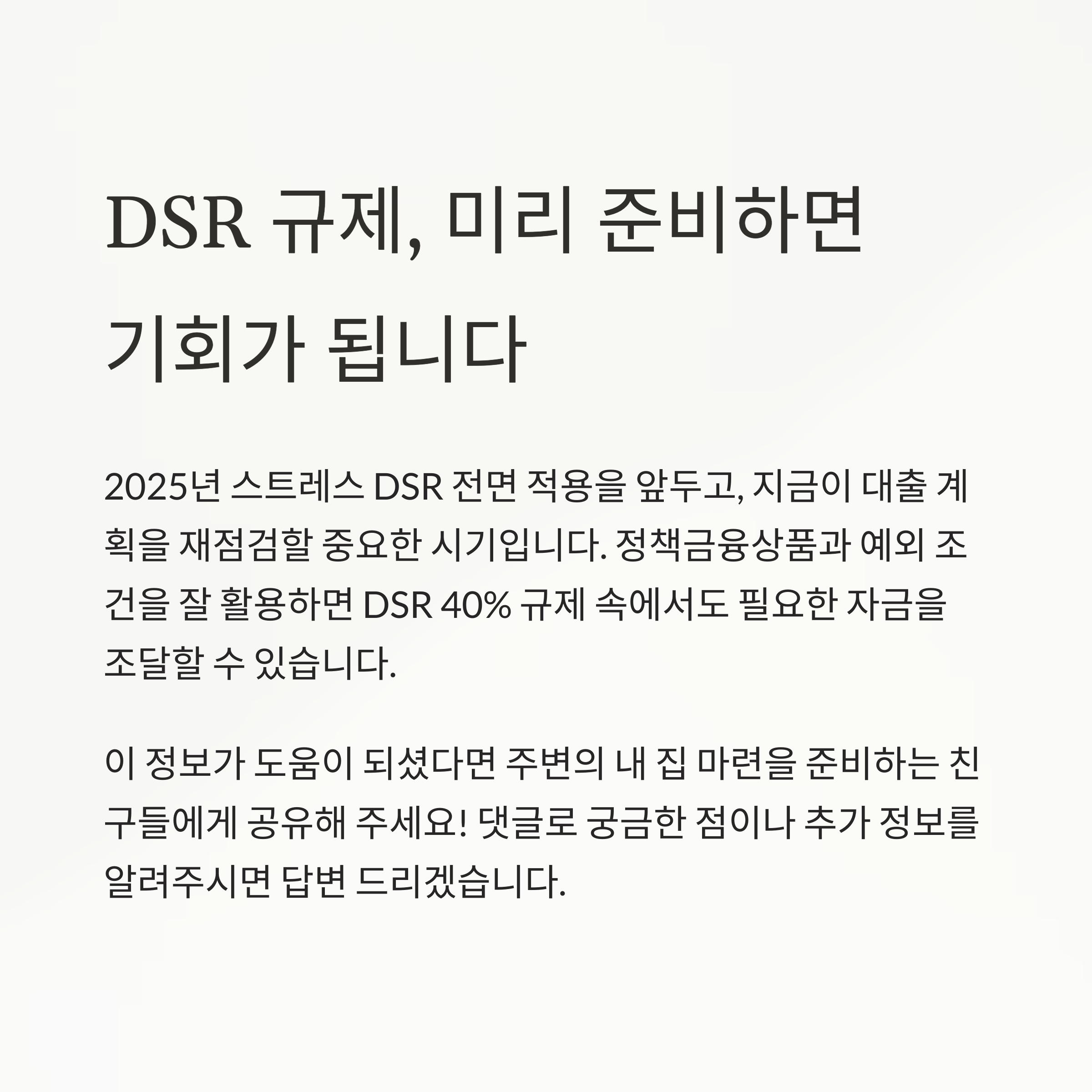하지만, 최근 금융위원회는 일부 정책상품에도 제한적 DSR 반영을 검토 중이기 때문에 앞으로는 상품별로 적용 여부가 달라질 수 있어 주의가 필요합니다.