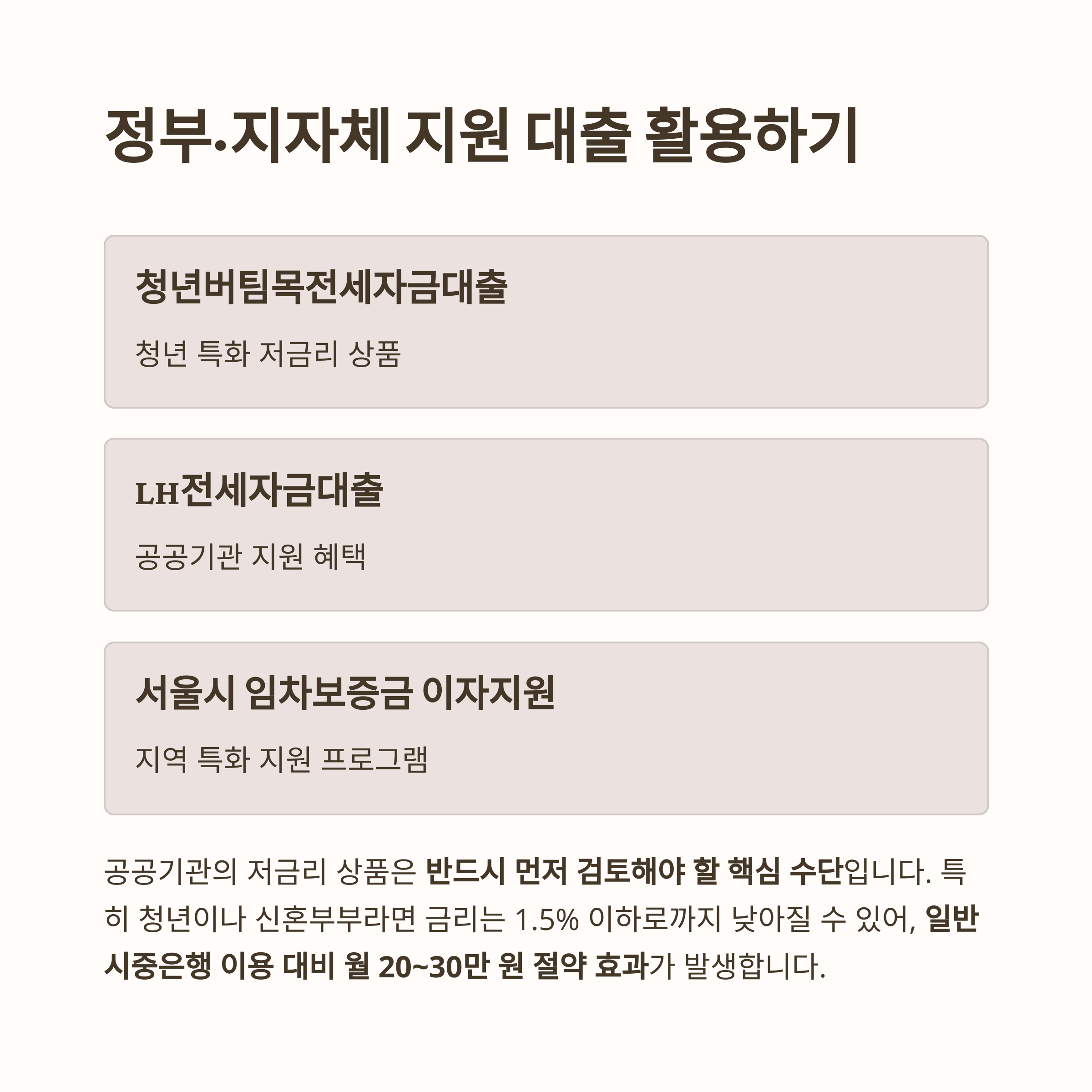 청년버팀목전세자금대출, LH전세자금대출, 서울시 임차보증금 이자지원 사업 등 공공기관의 저금리 상품은 반드시 먼저 검토해야 할 핵심 수단입니다.