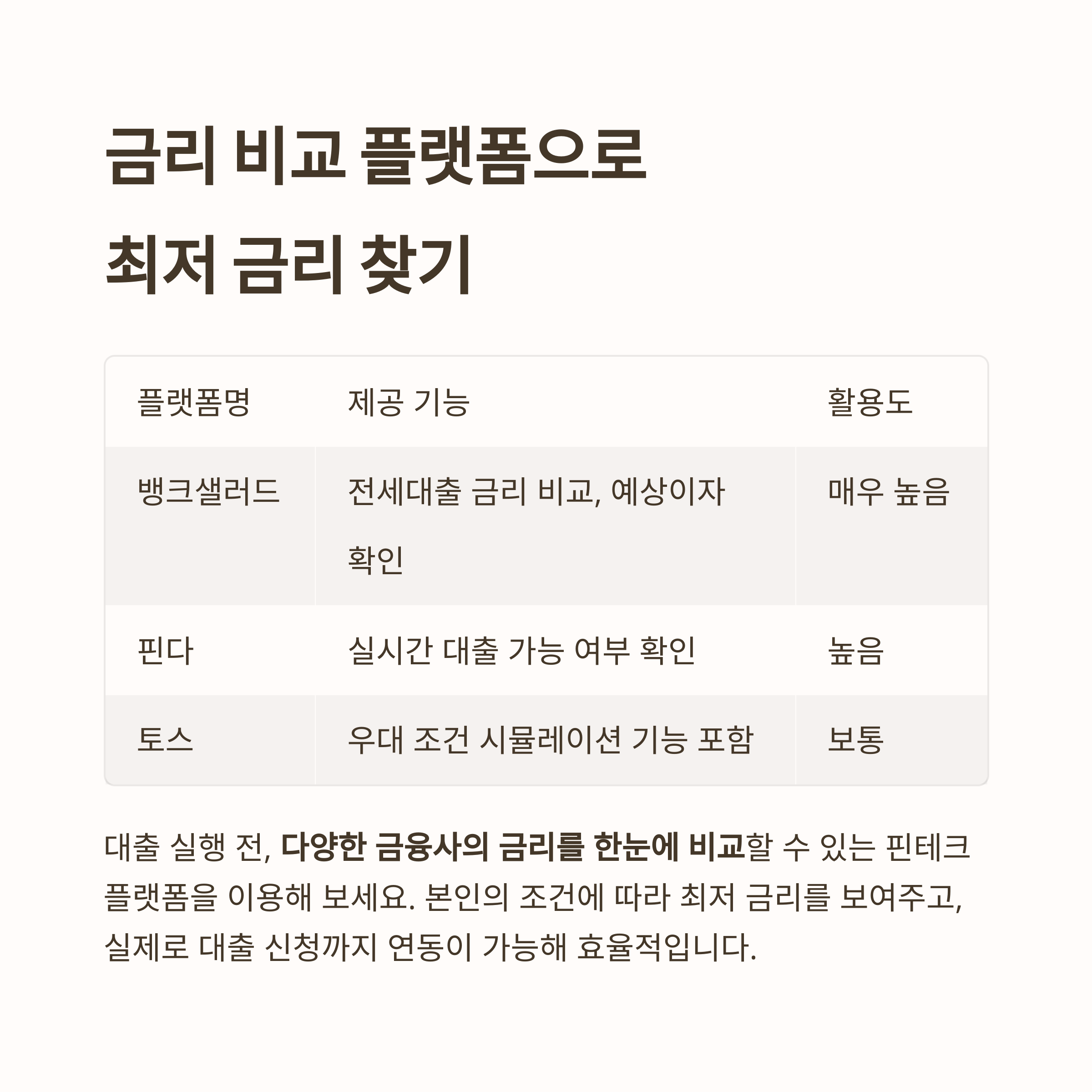 대출 실행 전, 다양한 금융사의 금리를 한눈에 비교할 수 있는 핀테크 플랫폼을 이용해 보세요.