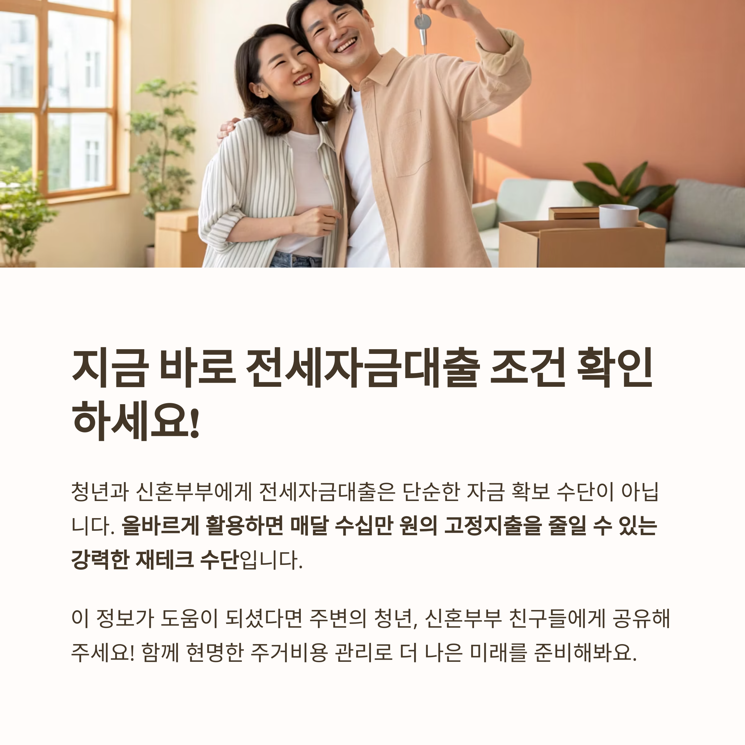 사회초년생으로 첫 보증금을 마련하기도, 신혼부부로 함께 새 보금자리를 꾸미기도 버거운 요즘, 슬기로운 전세대출 활용은 가계 지출에 큰 숨통을 틔워줄 수 있습니다.