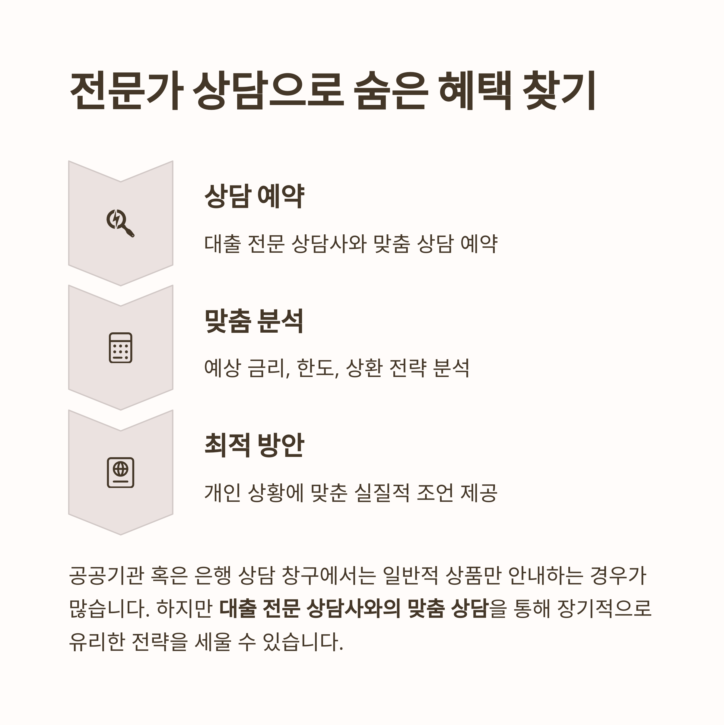 하지만 대출 전문 상담사와의 맞춤 상담을 통해 예상 금리, 한도, 상환 전략까지 개인 상황에 맞춘 실질적 조언을 받을 수 있어 장기적으로 유리합니다.
