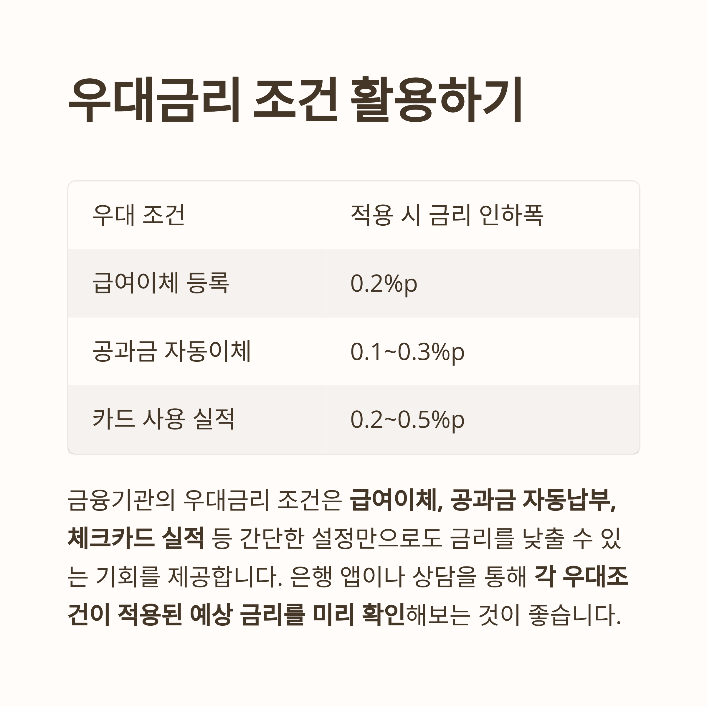 금융기관의 우대금리 조건은 급여이체, 공과금 자동납부, 체크카드 실적 등 간단한 설정만으로도 금리를 낮출 수 있는 기회를 제공합니다.