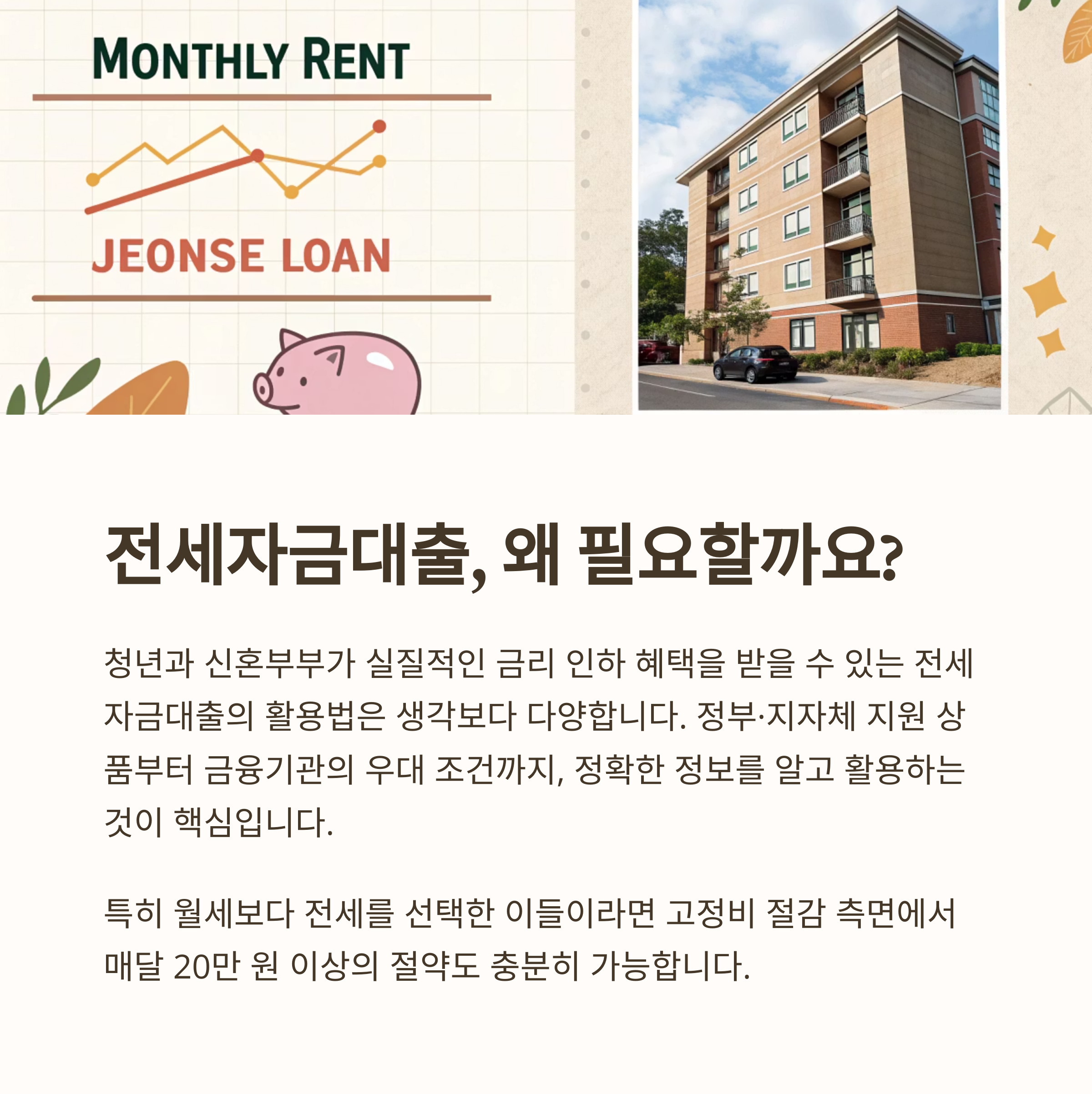 “월세 부담에 허리 휘는 대신, 전세자금대출로 매달 20만 원을 절약할 수 있다면 어떨까요?”