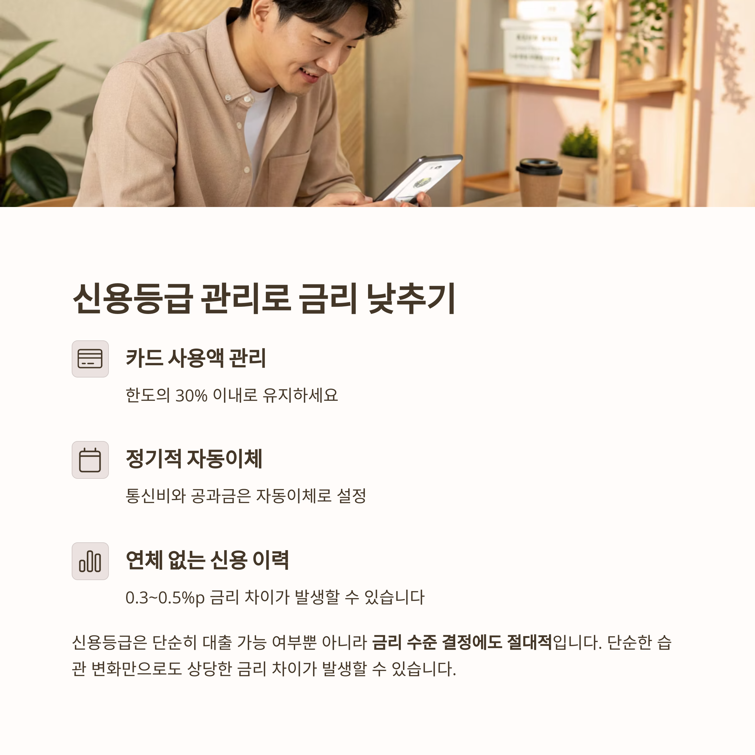 단순한 습관 변화만으로도 0.3~0.5%p 금리 차이가 발생할 수 있습니다.