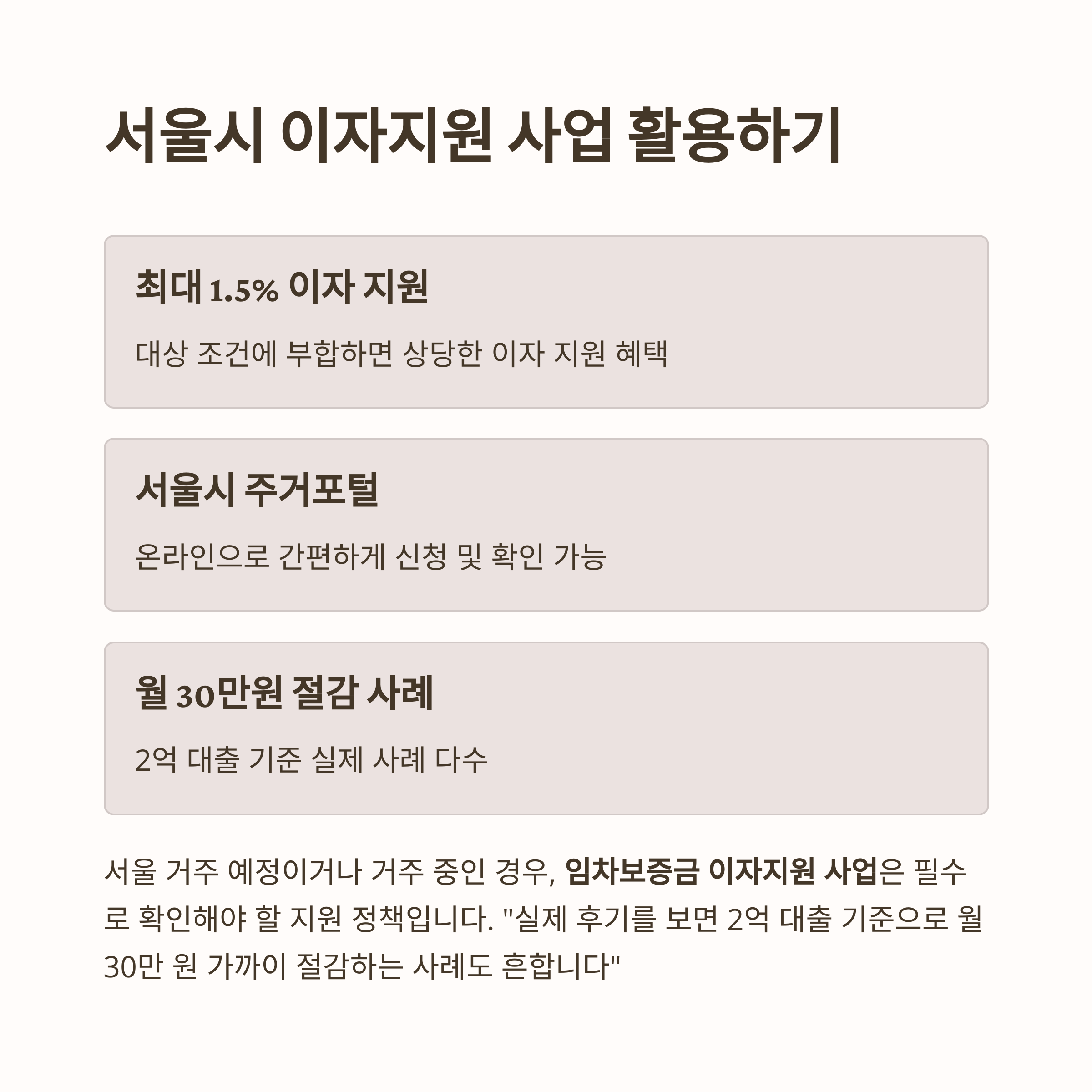 대상 조건에 부합하면 최대 1.5% 이자 지원을 받을 수 있으며, 서울시 주거포털을 통해 신청과 확인이 가능합니다.